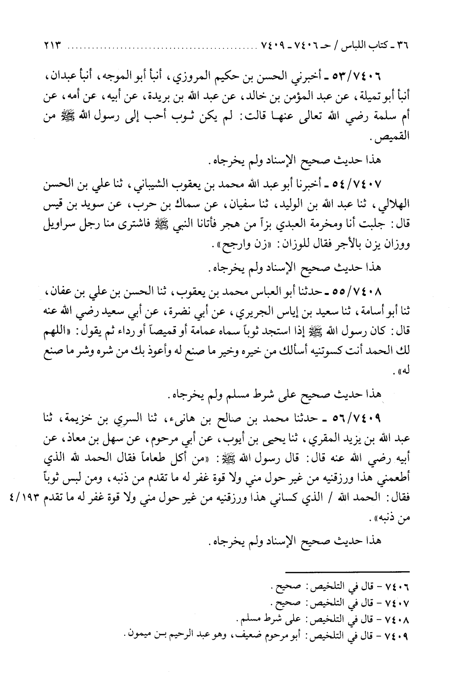 7408 - حَدَّثَنَا أَبُو الْعَبَّاسِ مُحَمَّدُ بْنُ يَعْقُوبَ، ثَنَا الْحَسَنُ بْنُ عَلِيِّ بْنِ عَفَّانَ، ثَنَا أَبُو أُسَامَةَ، ثَنَا سَعِيدُ بْنُ إِيَاسٍ الْجُرَيْرِيُّ، عَنْ أَبِي نَضْرَةَ، عَنْ أَبِي سَعِيدٍ رَضِيَ اللَّهُ عَنْهُ قَالَ: كَانَ رَسُولُ اللَّهِ صَلَّى اللهُ عَلَيْهِ وَسَلَّمَ إِذَا اسْتَجَدَّ ثَوْبًا سَمَّاهُ عِمَامَةً أَوْ قَمِيصًا أَوْ رِدَاءً ثُمَّ يَقُولُ: §«اللَّهُمَّ لَكَ الْحَمْدُ أَنْتَ كَسَوْتَنِيهِ أَسْأَلُكَ مِنْ خَيْرِهِ وَخَيْرِ مَا صُنِعَ لَهُ وَأَعُوذُ بِكَ مِنْ شَرِّهِ وَشَرِّ مَا صُنِعَ لَهُ» هَذَا حَدِيثٌ صَحِيحٌ عَلَى شَرْطِ مُسْلِمٍ وَلَمْ يُخَرِّجَاهُ "K7408 - على شرط مسلم
