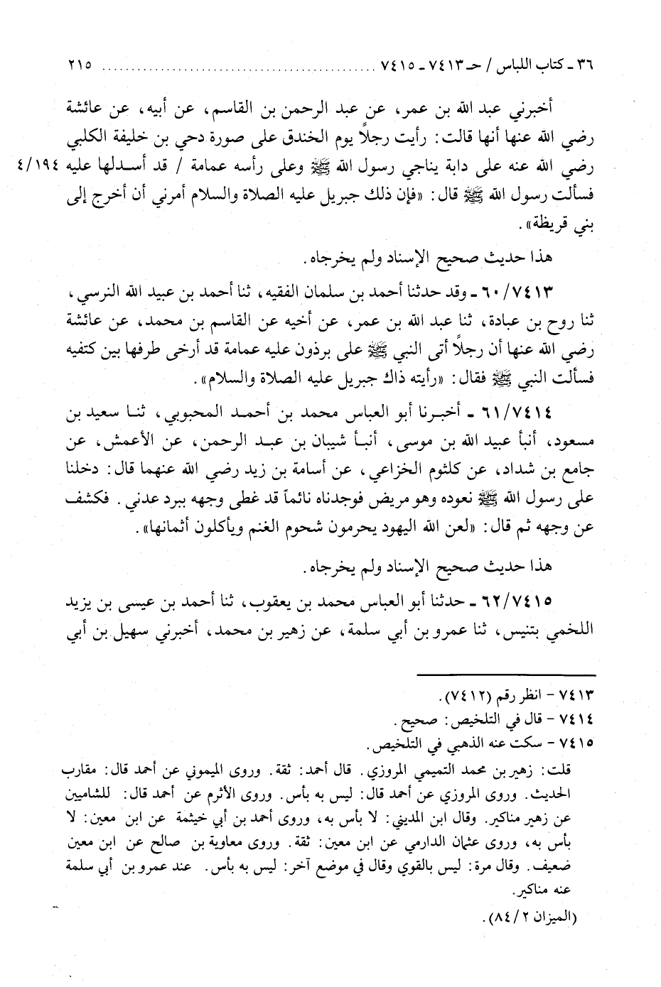 7413 - وَقَدْ حَدَّثَنَا أَحْمَدُ بْنُ سَلْمَانَ الْفَقِيهُ، ثَنَا أَحْمَدُ بْنُ عُبَيْدِ اللَّهِ النَّرْسِيُّ، ثَنَا رَوْحُ بْنُ عُبَادَةَ، ثَنَا عَبْدُ اللَّهِ بْنُ عُمَرَ، عَنْ أَخِيهِ، عَنِ الْقَاسِمِ بْنِ مُحَمَّدٍ، عَنْ عَائِشَةَ، رَضِيَ اللَّهُ عَنْهَا أَنَّ رَجُلًا أَتَى النَّبِيَّ صَلَّى اللهُ عَلَيْهِ وَسَلَّمَ عَلَى بِرْذَوْنٍ عَلَيْهِ عِمَامَةٌ قَدْ أَرْخَى طَرَفَهَا بَيْنَ كَتِفَيْهِ فَسَأَلْتُ النَّبِيَّ صَلَّى اللهُ عَلَيْهِ وَسَلَّمَ فَقَالَ: «رَأَيْتِهِ §ذَاكَ جِبْرِيلُ عَلَيْهِ الصَّلَاةُ وَالسَّلَامُ»