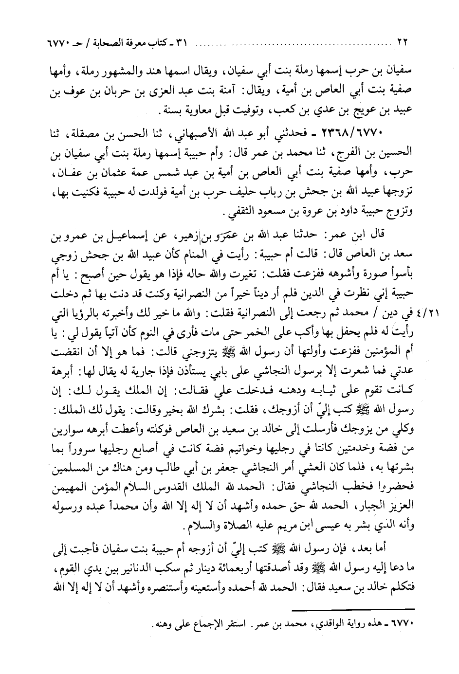 6770 - فَحَدَّثَنِي أَبُو عَبْدِ اللَّهِ الْأَصْبَهَانِيُّ، ثنا الْحَسَنُ بْنُ مَصْقَلَةَ، ثنا الْحُسَيْنُ بْنُ الْفَرَجِ، ثنا مُحَمَّدُ بْنُ عُمَرَ، قَالَ: «§وَأُمُّ حَبِيبَةَ اسْمُهَا رَمْلَةُ بِنْتُ أَبِي سُفْيَانَ بْنِ حَرْبٍ، وَأُمُّهَا صَفِيَّةُ بِنْتُ أَبِي الْعَاصِ بْنِ أُمَيَّةَ بْنِ عَبْدِ شَمْسٍ، عَمَّةُ عُثْمَانَ بْنِ عَفَّانَ تَزَوَّجَهَا عُبَيْدُ اللَّهِ بْنُ جَحْشِ بْنِ رَبَابٍ حَلِيفُ حَرْبِ بْنِ أُمَيَّةَ، فَوَلَدَتْ لَهُ حَبِيبَةَ فَكُنِّيَتْ بِهَا، وَتَزَوَّجَ حَبِيبَةَ دَاودُ بْنُ عُرْوَةَ بْنِ مَسْعُودٍ الثَّقَفِيُّ»