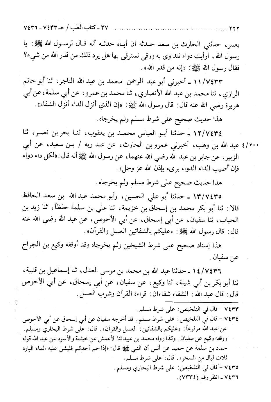 7435 - حَدَّثَنَا أَبُو عَلِيٍّ الْحُسَيْنُ، وَأَبُو مُحَمَّدٍ عَبْدُ اللَّهِ بْنُ سَعْدٍ الْحَافِظُ، قَالَا: ثَنَا أَبُو بَكْرٍ مُحَمَّدُ بْنُ إِسْحَاقَ بْنِ خُزَيْمَةَ، ثَنَا عَلِيُّ بْنُ سَلَمَةَ، حِفْظًا، ثَنَا زَيْدُ بْنُ الْحُبَابِ، ثَنَا سُفْيَانُ، عَنْ أَبِي إِسْحَاقَ، عَنْ أَبِي الْأَحْوَصِ، عَنْ عَبْدِ اللَّهِ، رَضِيَ اللَّهُ عَنْهُ قَالَ: قَالَ رَسُولُ اللَّهِ صَلَّى اللهُ عَلَيْهِ وَسَلَّمَ: " §عَلَيْكُمْ بِالشِّفَائَيْنِ: الْعَسَلُ وَالْقُرْآنُ «هَذَا إِسْنَادٌ صَحِيحٌ عَلَى شَرْطِ الشَّيْخَيْنِ وَلَمْ يُخَرِّجَاهُ» وَقَدْ أَوْقَفَهُ وَكِيعُ بْنُ الْجَرَّاحِ، عَنْ سُفْيَانَK7435 - على شرط البخاري ومسلم