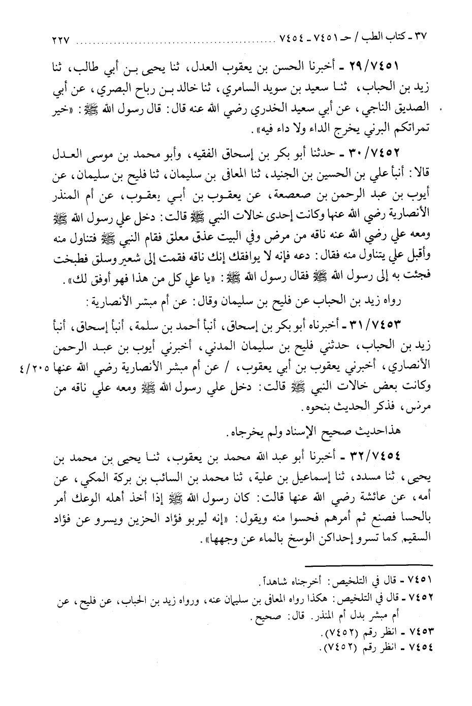 7453 - أَخْبَرَنَاهُ أَبُو بَكْرِ بْنُ إِسْحَاقَ، أَنْبَأَ أَحْمَدُ بْنُ سَلَمَةَ، أَنْبَأَ إِسْحَاقُ، أَنْبَأَ زَيْدُ بْنُ الْحُبَابِ، حَدَّثَنِي فُلَيْحُ بْنُ سُلَيْمَانَ الْمَدَنِيُّ، أَخْبَرَنِي أَيُّوبُ بْنُ عَبْدِ الرَّحْمَنِ الْأَنْصَارِيُّ، أَخْبَرَنِي يَعْقُوبُ بْنُ أَبِي يَعْقُوبَ، عَنْ أُمِّ مُبَشِّرٍ الْأَنْصَارِيَّةِ، رَضِيَ اللَّهُ عَنْهَا وَكَانَتْ بَعْضُ خَالَاتِ النَّبِيِّ صَلَّى اللهُ عَلَيْهِ وَسَلَّمَ قَالَتْ: دَخَلَ عَلَيَّ رَسُولُ اللَّهِ صَلَّى اللهُ عَلَيْهِ وَسَلَّمَ وَمَعَهُ عَلِيٌّ نَاقِهٌ مِنْ مَرَضٍ، فَذَكَرَ الْحَدِيثَ بِنَحْوِهِ «هَذَا حَدِيثٌ صَحِيحُ الْإِسْنَادِ وَلَمْ يُخَرِّجَاهُ» K7452 - صحيح
