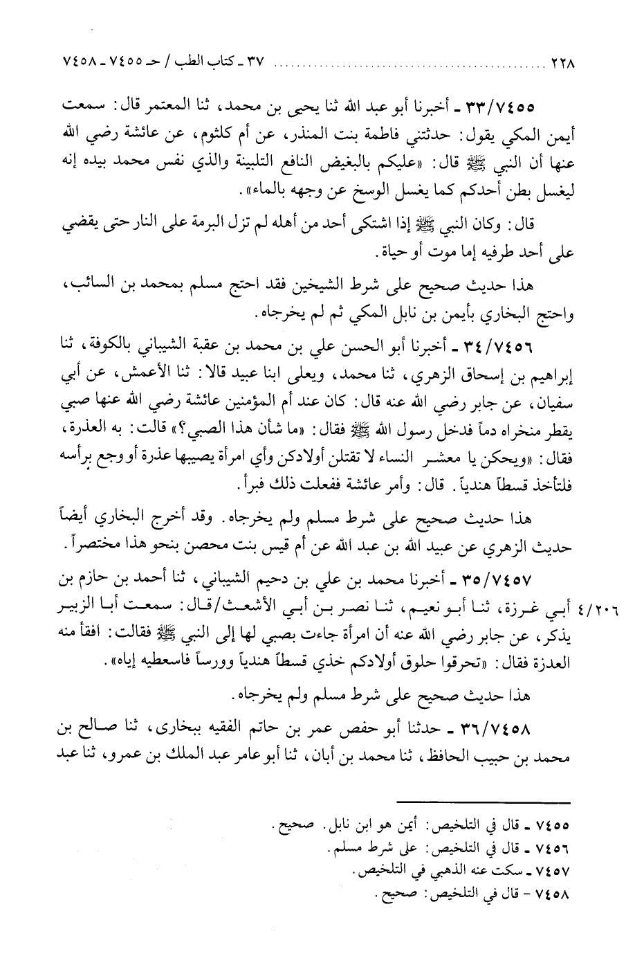 7457 - أَخْبَرَنَا مُحَمَّدُ بْنُ عَلِيِّ بْنِ دُحَيْمٍ الشَّيْبَانِيُّ، ثَنَا أَحْمَدُ بْنُ حَازِمِ بْنِ أَبِي غَرَزَةَ، ثَنَا أَبُو نُعَيْمٍ، ثَنَا نَصْرُ بْنُ أَبِي الْأَشْعَثِ، قَالَ: سَمِعْتُ أَبَا الزُّبَيْرِ، يَذْكُرُ عَنْ جَابِرٍ، رَضِيَ اللَّهُ عَنْهُ أَنَّ امْرَأَةً جَاءَتْ بِصَبِيٍّ لَهَا إِلَى النَّبِيِّ صَلَّى اللهُ عَلَيْهِ وَسَلَّمَ فَقَالَتْ: افْقَأْ مِنْهُ الْعُذْرَةَ، فَقَالَ: §«تُحَرِّقُوا حُلُوقَ أَوْلَادِكُمْ خُذِي قُسْطًا هِنْدِيًّا وَوَرْسًا فَأَسْعِطِيهِ إِيَّاهُ» هَذَا حَدِيثٌ صَحِيحٌ عَلَى شَرْطِ مُسْلِمٍ وَلَمْ يُخَرِّجَاهُ "K7457 - سكت عنه الذهبي في التلخيص