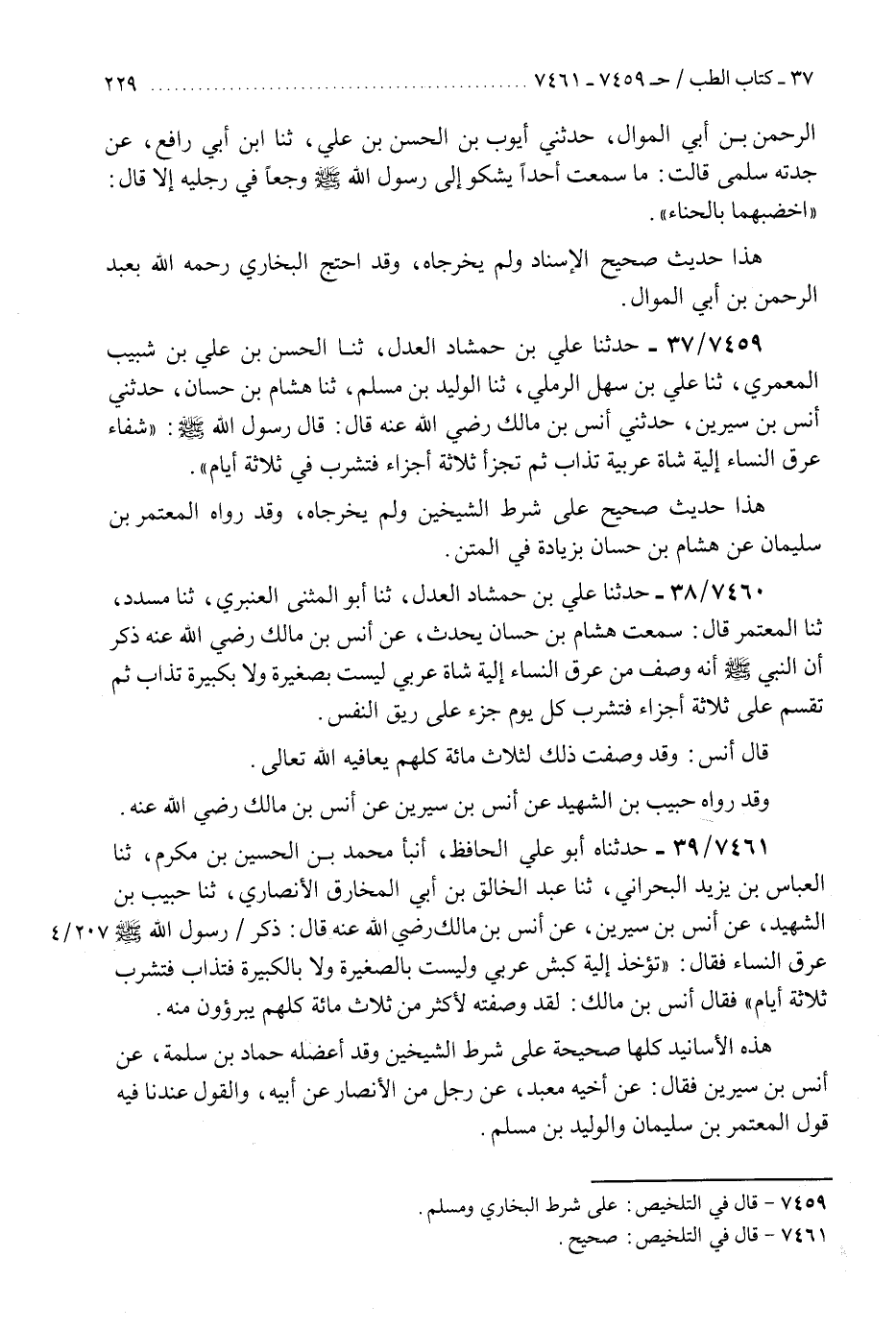 7461 - حَدَّثَنَاهُ أَبُو عَلِيٍّ الْحَافِظُ، أَنْبَأَ مُحَمَّدُ بْنُ الْحُسَيْنِ بْنِ مُكْرَمٍ، ثَنَا الْعَبَّاسُ بْنُ يَزِيدَ الْبَحْرَانِيُّ، ثَنَا عَبْدُ الْخَالِقِ بْنُ أَبِي الْمُخَارِقِ الْأَنْصَارِيُّ، ثَنَا حَبِيبُ بْنُ الشَّهِيدِ، عَنْ أَنَسِ بْنِ سِيرِينَ، عَنْ أَنَسِ بْنِ مَالِكٍ، رَضِيَ اللَّهُ عَنْهُ قَالَ: ذَكَرَ رَسُولُ اللَّهِ صَلَّى اللهُ عَلَيْهِ وَسَلَّمَ عِرْقَ النَّسَا فَقَالَ: §«تُؤْخَذُ أَلْيَةُ كَبْشٍ عَرَبِيٍّ وَلَيْسَتْ بِالصَّغِيرَةِ وَلَا بِالْكَبِيرَةِ فَتُذَابَ فَتُشْرَبُ ثَلَاثَةَ أَيَّامٍ» فَقَالَ أَنَسُ بْنُ مَالِكٍ: «لَقَدْ وَصَفْتُهُ لِأَكْثَرَ مِنْ ثَلَاثِ مِائَةٍ كُلُّهُمْ يَبْرَءُونَ مِنْهُ» هَذِهِ الْأَسَانِيدُ كُلُّهَا صَحِيحَةٌ عَلَى شَرْطِ الشَّيْخَيْنِ " وَقَدْ أَعْضَلَهُ حَمَّادُ بْنُ سَلَمَةَ، عَنْ أَنَسِ بْنِ سِيرِينَ، فَقَالَ: عَنْ أَخِيهِ مَعْبَدٍ، عَنْ رَجُلٍ، مِنَ الْأَنْصَارِ، عَنْ أَبِيهِ، «وَالْقَوْلُ عِنْدَنَا فِيهِ قَوْلُ الْمُعْتَمِرِ بْنِ سُلَيْمَانَ وَالْوَلِيدِ بْنِ مُسْلِمٍ» K7461 - صحيح
