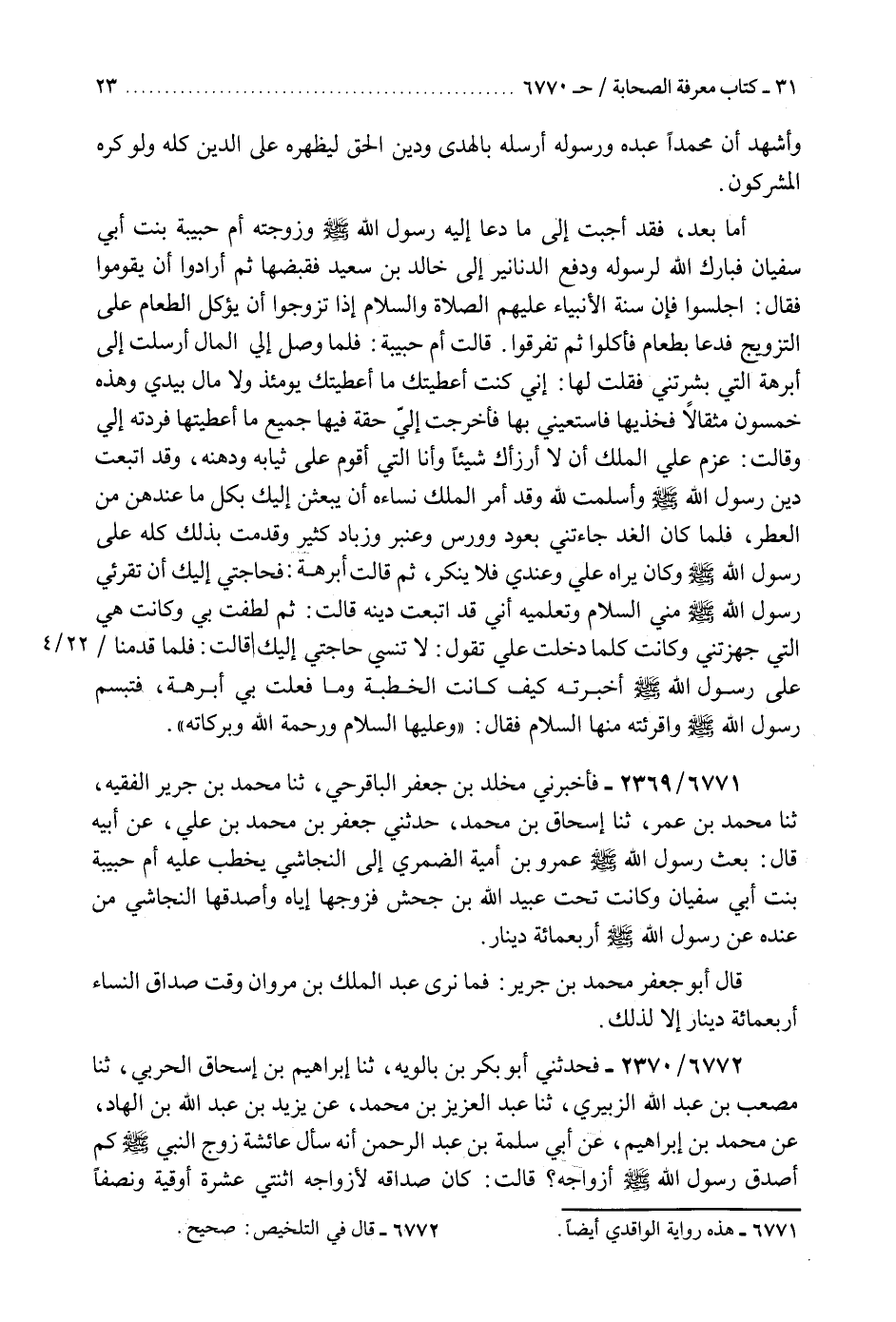 6771 - فَأَخْبَرَنِي مَخْلَدُ بْنُ جَعْفَرٍ الْبَاقَرْحِيُّ، ثنا مُحَمَّدُ بْنُ جَرِيرٍ الْفَقِيهُ، ثنا مُحَمَّدُ بْنُ عُمَرَ، ثنا إِسْحَاقُ بْنُ مُحَمَّدٍ، حَدَّثَنِي جَعْفَرُ بْنُ مُحَمَّدِ بْنِ عَلِيٍّ، عَنْ أَبِيهِ، قَالَ: §«بَعَثَ رَسُولُ اللَّهِ صَلَّى اللهُ عَلَيْهِ وَسَلَّمَ عَمْرَو بْنَ أُمَيَّةَ الضَّمْرِيَّ إِلَى النَّجَاشِيِّ يَخْطُبُ عَلَيْهِ أُمَّ حَبِيبَةَ بِنْتَ أَبِي سُفْيَانَ، وَكَانَتْ تَحْتَ عُبَيْدِ اللَّهِ بْنِ جَحْشٍ فَزَوَّجَهَا إِيَّاهُ وَأَصْدَقَهَا النَّجَاشِيُّ مِنْ عِنْدِهِ عَنْ رَسُولِ اللَّهِ صَلَّى اللهُ عَلَيْهِ وَسَلَّمَ أَرْبَعَمِائَةِ دِينَارٍ» قَالَ أَبُو جَعْفَرٍ مُحَمَّدُ بْنُ جَرِيرٍ: «فَمَا نَرَى عَبْدَ الْمَلِكِ بْنَ مَرْوَانَ وَقَّتَ صَدَاقَ النِّسَاءِ أَرْبَعَمِائَةِ دِينَارٍ إِلَّا لِذَلِكَ»