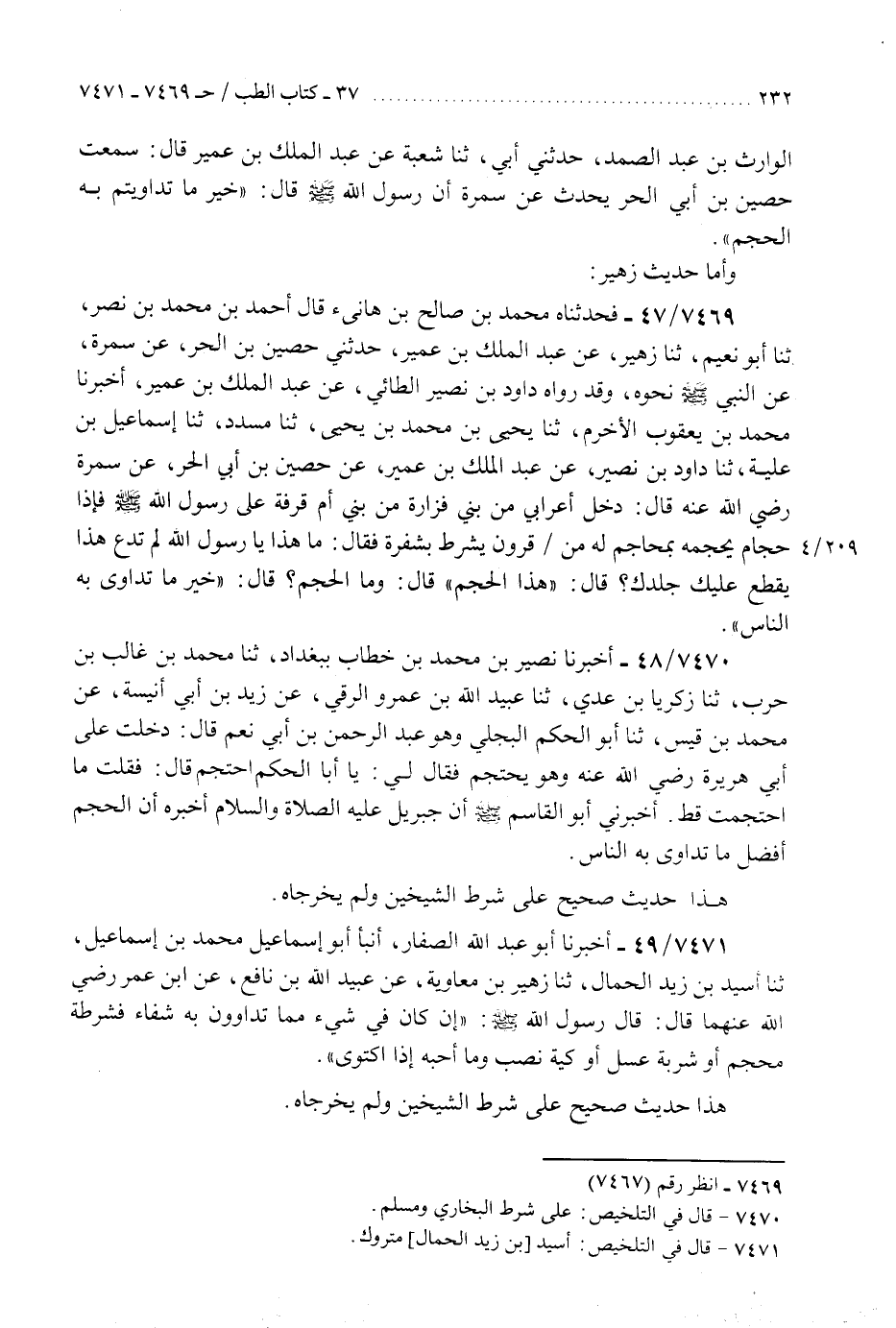 7470 - أَخْبَرَنَا نُصَيْرُ بْنُ مُحَمَّدِ بْنِ خَطَّابٍ، بِبَغْدَادَ، ثَنَا مُحَمَّدُ بْنُ غَالِبِ بْنِ حَرْبٍ، ثَنَا زَكَرِيَّا بْنُ عَدِيٍّ، ثَنَا عُبَيْدُ اللَّهِ بْنُ عَمْرٍو الرَّقِّيُّ، عَنْ زَيْدِ بْنِ أَبِي أُنَيْسَةَ، عَنْ مُحَمَّدِ بْنِ قَيْسٍ، ثَنَا أَبُو الْحَكَمِ الْبَجَلِيُّ وَهُوَ عَبْدُ الرَّحْمَنِ بْنُ أَبِي نُعْمٍ قَالَ: دَخَلْتُ عَلَى أَبِي هُرَيْرَةَ، رَضِيَ اللَّهُ عَنْهُ وَهُوَ يَحْتَجِمُ، فَقَالَ لِي: يَا أَبَا الْحَكَمِ، احْتَجِمْ قَالَ: فَقُلْتُ: مَا احْتَجَمْتُ قَطُّ. «أَخْبَرَنِي أَبُو الْقَاسِمِ صَلَّى اللهُ عَلَيْهِ وَسَلَّمَ أَنَّ جِبْرِيلَ عَلَيْهِ الصَّلَاةُ وَالسَّلَامُ أَخْبَرَهُ أَنَّ §الْحَجْمَ أَفْضَلُ مَا تَدَاوَى بِهِ النَّاسُ» هَذَا حَدِيثٌ صَحِيحٌ عَلَى شَرْطِ الشَّيْخَيْنِ وَلَمْ يُخَرِّجَاهُ "K7470 - على شرط البخاري ومسلم