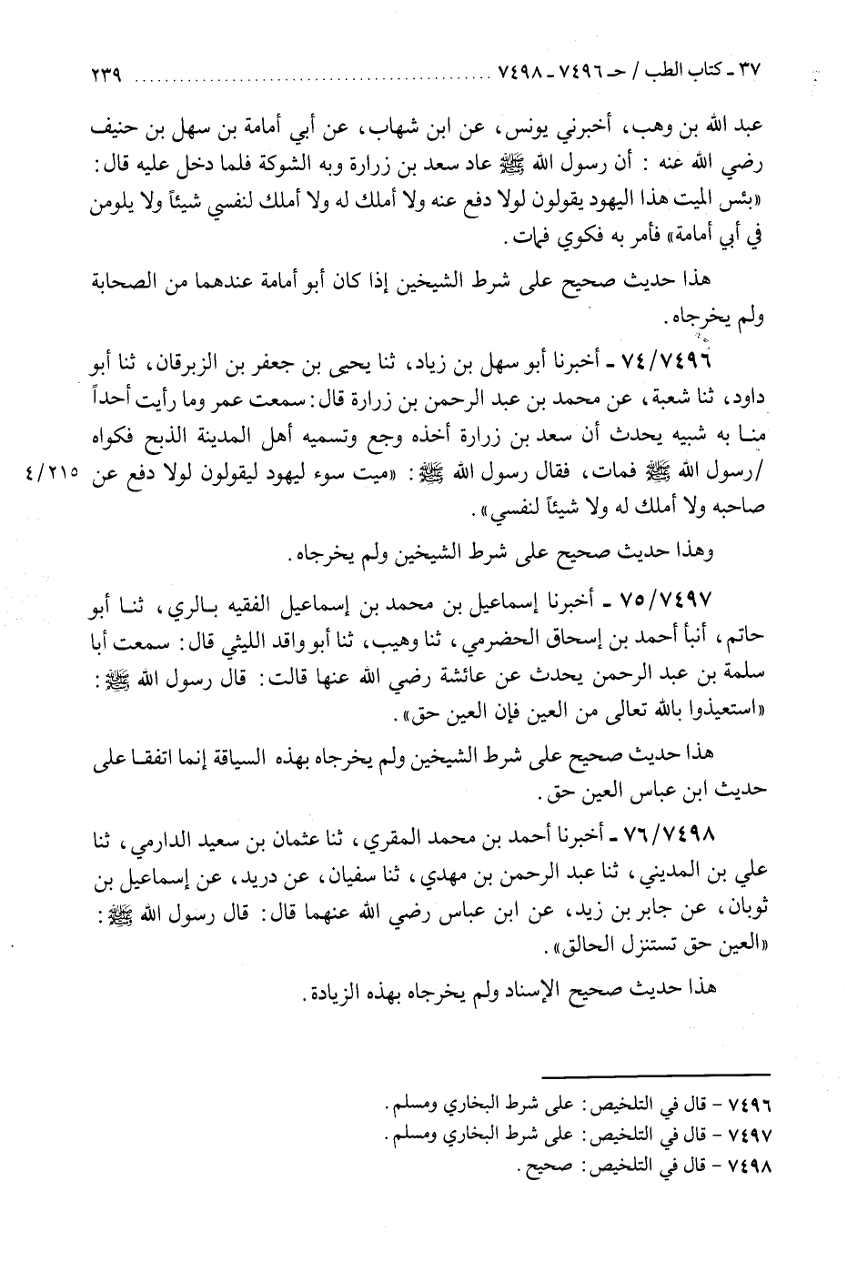 7497 - أَخْبَرَنَا إِسْمَاعِيلُ بْنُ مُحَمَّدِ بْنِ إِسْمَاعِيلَ الْفَقِيهُ بِالرَّيِّ، ثَنَا أَبُو حَاتِمٍ، أَنْبَأَ أَحْمَدُ بْنُ إِسْحَاقَ الْحَضْرَمِيُّ، ثَنَا وُهَيْبٌ، ثَنَا أَبُو وَاقِدٍ اللَّيْثِيُّ، قَالَ: سَمِعْتُ أَبَا سَلَمَةَ بْنَ عَبْدِ الرَّحْمَنِ يُحَدِّثُ عَنْ عَائِشَةَ، رَضِيَ اللَّهُ عَنْهَا قَالَتْ: قَالَ رَسُولُ اللَّهِ صَلَّى اللهُ عَلَيْهِ وَسَلَّمَ: §«اسْتَعِيذُوا بِاللَّهِ تَعَالَى مِنَ الْعَيْنِ فَإِنَّ الْعَيْنَ حَقٌّ» هَذَا حَدِيثٌ صَحِيحٌ عَلَى شَرْطِ الشَّيْخَيْنِ وَلَمْ يُخَرِّجَاهُ بِهَذِهِ السِّيَاقَةِ إِنَّمَا اتَّفَقَا عَلَى حَدِيثِ ابْنِ عَبَّاسٍ الْعَيْنُ حَقٌّ "K7497 - على شرط البخاري ومسلم