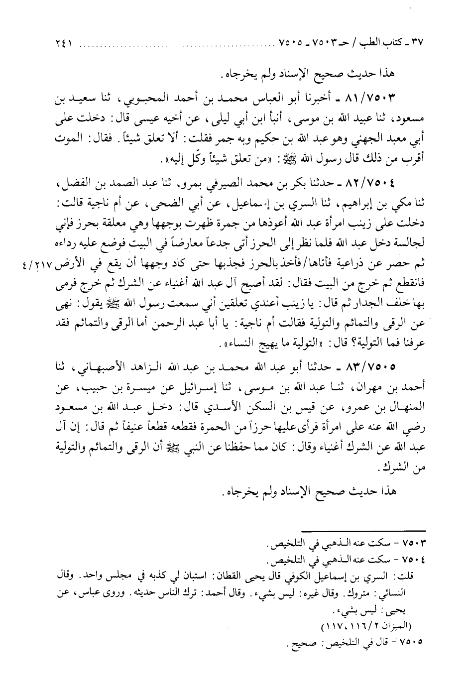 7504 - حَدَّثَنَا بَكْرُ بْنُ مُحَمَّدٍ الصَّيْرَفِيُّ، بِمَرْوَ، ثَنَا عَبْدُ الصَّمَدِ بْنُ الْفَضْلِ، ثَنَا مَكِّيُّ بْنُ إِبْرَاهِيمَ، ثَنَا السَّرِيُّ بْنُ إِسْمَاعِيلَ، عَنْ أَبِي الضُّحَى، عَنْ أُمِّ نَاجِيَةَ، قَالَتْ: دَخَلْتُ عَلَى زَيْنَبَ امْرَأَةِ عَبْدِ اللَّهِ أَعُوذُهَا مِنْ جَمْرَةٍ ظَهَرَتْ بِوَجْهِهَا وَهِيَ مُعَلَّقَةٌ بِحِرْزٍ فَإِنِّي لَجَالِسَةٌ دَخَلَ عَبْدُ اللَّهِ، فَلَمَّا نَظَرَ إِلَى الْحِرْزِ أَتَى جِدْعًا مُعَارِضًا فِي الْبَيْتِ فَوَضَعَ عَلَيْهِ رِدَاءَهُ، ثُمَّ حَصَرَ عَنْ ذِرَاعَيْهِ فَأَتَاهَا فَأَخَذَ بِالْحِرْزِ فَجَذَبَهَا حَتَّى كَادَ وَجْهُهَا أَنْ يَقَعَ فِي الْأَرْضِ فَانْقَطَعَ ثُمَّ خَرَجَ مِنَ الْبَيْتِ فَقَالَ: لَقَدْ أَصْبَحَ آلُ عَبْدِ اللَّهِ أَغْنِيَاءَ عَنِ الشِّرْكِ، ثُمَّ خَرَجَ فَرَمَى بِهَا خَلْفَ الْجِدَارِ ثُمَّ قَالَ: يَا زَيْنَبُ أَعِنْدِي تُعَلِّقِينَ إِنِّي سَمِعْتُ رَسُولَ اللَّهِ صَلَّى اللهُ عَلَيْهِ وَسَلَّمَ يَقُولُ: «§نَهَى عَنِ الرُّقَى وَالتَّمَائِمِ وَالتَّوْلِيَةِ» فَقَالَتْ أُمُّ نَاجِيَةَ: يَا أَبَا عَبْدِ الرَّحْمَنِ أَمَّا الرُّقَى وَالتَّمَائِمُ فَقَدْ عَرَفْنَا فَمَا التَّوْلِيَةُ؟ قَالَ: التَّوْلِيَةُ مَا يُهَيِّجُ النِّسَاءَK7504 - سكت عنه الذهبي في التلخيص