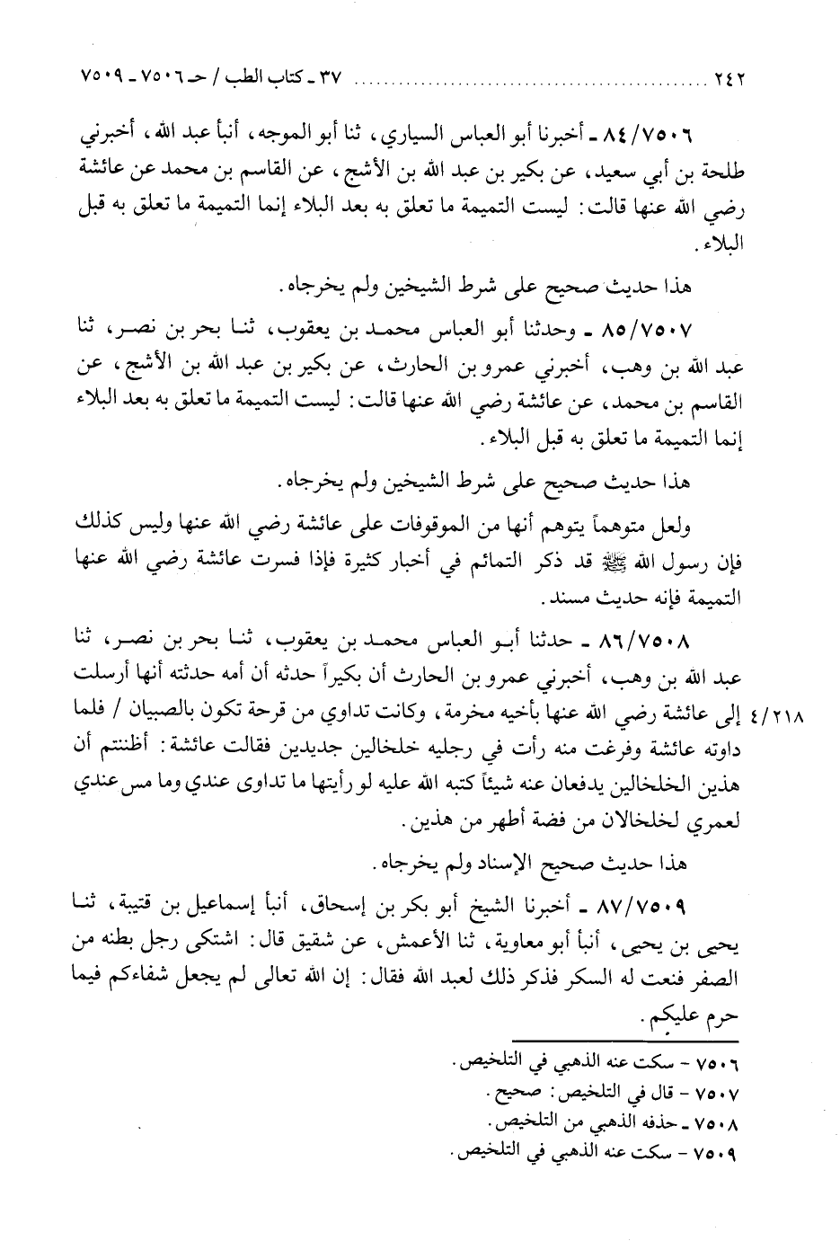 7507 - وَحَدَّثَنَا أَبُو الْعَبَّاسِ مُحَمَّدُ بْنُ يَعْقُوبَ، ثَنَا بَحْرُ بْنُ نَصْرٍ، ثَنَا عَبْدُ اللَّهِ بْنُ وَهْبٍ، أَخْبَرَنِي عَمْرُو بْنُ الْحَارِثِ، عَنْ بُكَيْرِ بْنِ عَبْدِ اللَّهِ بْنِ الْأَشَجِّ، عَنِ الْقَاسِمِ بْنِ مُحَمَّدٍ، عَنْ عَائِشَةَ، رَضِيَ اللَّهُ عَنْهَا قَالَتْ: §«لَيْسَتِ التَّمِيمَةُ مَا تَعَلَّقَ بِهِ بَعْدَ الْبَلَاءِ، إِنَّمَا التَّمِيمةُ مَا تَعَلَّقَ بِهِ قَبْلَ الْبَلَاءِ» هَذَا حَدِيثٌ صَحِيحٌ عَلَى شَرْطِ الشَّيْخَيْنِ وَلَمْ يُخَرِّجَاهُ «وَلَعَلَّ مُتَوَهِّمًا يَتَوَهَّمُ أَنَّهَا مِنَ الْمَوْقُوفَاتِ عَلَى عَائِشَةَ رَضِيَ اللَّهُ عَنْهَا وَلَيْسَ كَذَلِكَ فَإِنَّ رَسُولَ اللَّهِ صَلَّى اللهُ عَلَيْهِ وَسَلَّمَ قَدْ ذَكَرَ التَّمَائِمِ فِي أَخْبَارٍ كَثِيرَةٍ فَإِذَا فَسَّرَتْ عَائِشَةُ رَضِيَ اللَّهُ عَنْهَا التَّمِيمَةَ فَإِنَّهُ حَدِيثٌ مُسْنَدٌ» K7507 - صحيح