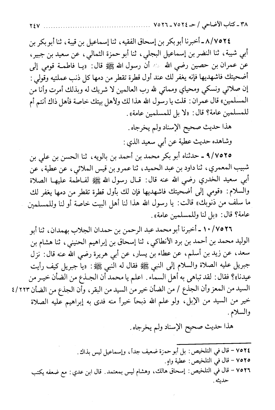 7526 - أَخْبَرَنَا أَبُو مُحَمَّدٍ عَبْدُ الرَّحْمَنِ بْنُ حَمْدَانَ الْجَلَّابُ، بِهَمْدَانَ، ثَنَا أَبُو الْوَلِيدِ مُحَمَّدُ بْنُ أَحْمَدَ بْنِ بُرْدٍ الْأَنْطَاكِيُّ، ثَنَا إِسْحَاقُ بْنُ إِبْرَاهِيمَ الْحُنَيْنِيُّ، ثَنَا هِشَامُ بْنُ سَعْدٍ، عَنْ زَيْدِ بْنِ أَسْلَمَ، عَنْ عَطَاءِ بْنِ يَسَارٍ، عَنْ أَبِي هُرَيْرَةَ، رَضِيَ اللَّهُ عَنْهُ قَالَ: نَزَلَ جِبْرِيلُ عَلَيْهِ الصَّلَاةُ وَالسَّلَامُ إِلَى النَّبِيِّ صَلَّى اللهُ عَلَيْهِ وَسَلَّمَ، فَقَالَ لَهُ النَّبِيُّ صَلَّى اللهُ عَلَيْهِ وَسَلَّمَ: «§يَا جِبْرِيلُ كَيْفَ رَأَيْتَ عِيدَنَا؟» فَقَالَ: لَقَدْ تَبَاهَى بِهِ أَهْلُ السَّمَاءِ. اعْلَمْ يَا مُحَمَّدُ أَنَّ الْجَذَعَ مِنَ الضَّأْنِ خَيْرٌ مِنَ السَّيِّدِ مِنَ الْمَعْزِ، وَأَنَّ الْجَذَعَ مِنَ الضَّأْنِ خَيْرٌ مِنَ السَّيِّدِ مِنَ الْبَقَرِ، وَأَنَّ الْجَذَعَ مِنَ الضَّأْنِ خَيْرٌ مِنَ السَّيِّدِ مِنَ الْإِبِلِ، وَلَوْ عَلِمَ اللَّهُ ذَبْحًا خَيْرًا مِنْهُ فَدَى بِهِ إِبْرَاهِيمَ عَلَيْهِ الصَّلَاةُ وَالسَّلَامُ «هَذَا حَدِيثٌ صَحِيحُ الْإِسْنَادِ وَلَمْ يُخَرِّجَاهُ» K7526 - إسحاق هالك