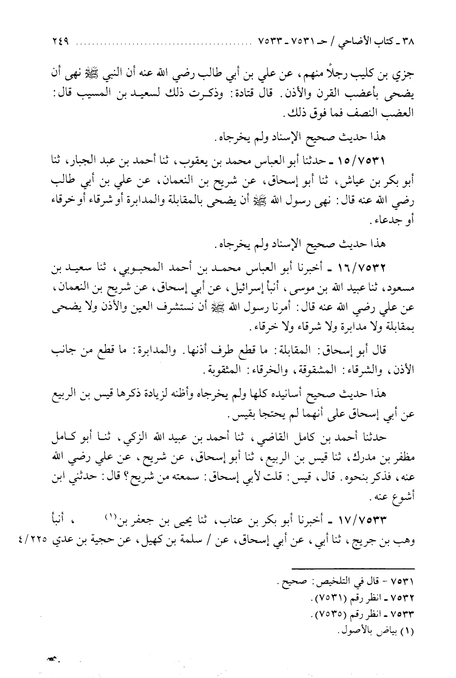 7532 - أَخْبَرَنَا أَبُو الْعَبَّاسِ مُحَمَّدُ بْنُ أَحْمَدَ الْمَحْبُوبِيُّ، ثَنَا سَعِيدُ بْنُ مَسْعُودٍ، ثَنَا عُبَيْدُ اللَّهِ بْنُ مُوسَى، أَنْبَأَ إِسْرَائِيلُ، عَنْ أَبِي إِسْحَاقَ، عَنْ شُرَيْحِ بْنِ النُّعْمَانِ، عَنْ عَلِيٍّ، رَضِيَ اللَّهُ عَنْهُ قَالَ: §«أَمَرَنَا رَسُولُ اللَّهِ صَلَّى اللهُ عَلَيْهِ وَسَلَّمَ أَنْ نَسْتَشْرِفَ الْعَيْنَ وَالْأُذُنَ وَلَا يُضَحَّى بِمُقَابَلَةٍ وَلَا مُدَابَرَةٍ وَلَا شَرْقَاءَ وَلَا خَرْقَاءَ» قَالَ أَبُو إِسْحَاقَ: " الْمُقَابَلَةُ: مَا قُطِعَ طَرَفُ أُذُنِهَا، وَالْمُدَابَرَةُ: مَا قُطِعَ مِنْ جَانِبِ الْأُذُنِ، وَالشَّرْقَاءُ: الْمَشْقُوقَةُ، وَالْخَرْقَاءُ: الْمَثْقُوبَةُ «هَذَا حَدِيثٌ صَحِيحٌ أَسَانِيدُهُ كُلُّهَا وَلَمْ يُخَرِّجَاهُ وَأَظُنُّهُ لِزِيَادَةٍ ذَكَرَهَا قَيْسُ بْنُ الرَّبِيعِ، عَنْ أَبِي إِسْحَاقَ عَلَى أَنَّهُمَا لَمْ يَحْتَجَّا بِقَيْسٍ» حَدَّثَنَا أَحْمَدُ بْنُ كَامِلٍ الْقَاضِي، ثَنَا أَحْمَدُ بْنُ عُبَيْدِ اللَّهِ الزَّكِيُّ، ثَنَا أَبُو كَامِلٍ مُظَفَّرُ بْنُ مُدْرِكٍ، ثَنَا قَيْسُ بْنُ الرَّبِيعِ، ثَنَا أَبُو إِسْحَاقَ، عَنْ شُرَيْحٍ، عَنْ عَلِيٍّ رَضِيَ اللَّهُ عَنْهُ فَذَكَرَ بِنَحْوِهِ. قَالَ قَيْسٌ: قُلْتُ لِأَبِي إِسْحَاقَ: سَمِعْتُهُ مِنْ شُرَيْحٍ؟ قَالَ: حَدَّثَنِي ابْنُ أَشْوَعَ، عَنْهُ