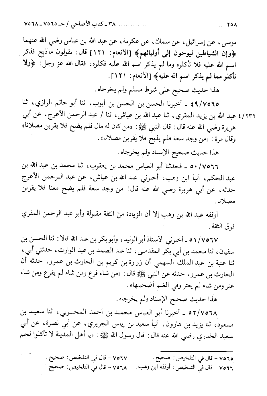 7566 - فَحَدَّثَنَا أَبُو الْعَبَّاسِ مُحَمَّدُ بْنُ يَعْقُوبَ، ثَنَا مُحَمَّدُ بْنُ عَبْدِ اللَّهِ بْنِ عَبْدِ الْحَكَمِ، أَنْبَأَ ابْنُ وَهْبٍ، أَخْبَرَنِي عَبْدُ اللَّهِ بْنُ عَيَّاشٍ، عَنْ عَبْدِ الرَّحْمَنِ الْأَعْرَجِ، حَدَّثَهُ عَنْ أَبِي هُرَيْرَةَ، رَضِيَ اللَّهُ عَنْهُ قَالَ: §«مَنْ وَجَدَ سَعَةً فَلَمْ يُضَحِّ مَعَنَا فَلَا يَقْرَبَنَّ مُصَلَّانَا» أَوْقَفَهُ عَبْدُ اللَّهِ بْنُ وَهْبٍ إِلَّا أَنَّ الزِّيَادَةَ مِنَ الثِّقَةِ مَقْبُولَةٌ وَأَبُو عَبْدِ الرَّحْمَنِ الْمُقْرِئُ فَوْقَ الثِّقَةِ "