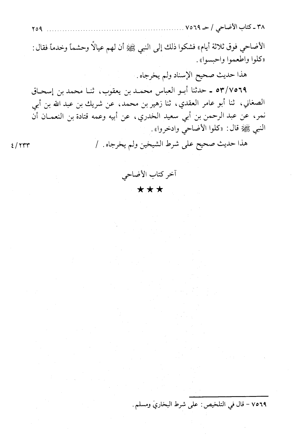 7569 - حَدَّثَنَا أَبُو الْعَبَّاسِ مُحَمَّدُ بْنُ يَعْقُوبَ، ثَنَا مُحَمَّدُ بْنُ إِسْحَاقَ الصَّغَانِيُّ، ثَنَا أَبُو عَامِرٍ الْعَقَدِيُّ، ثَنَا زُهَيْرُ بْنُ مُحَمَّدٍ، عَنْ شَرِيكِ بْنِ عَبْدِ اللَّهِ بْنِ أَبِي نَمِرٍ، عَنْ عَبْدِ الرَّحْمَنِ بْنِ أَبِي سَعِيدٍ الْخُدْرِيِّ، عَنْ أَبِيهِ، وَعَمِّهِ قَتَادَةَ بْنِ النُّعْمَانِ، أَنَّ النَّبِيَّ صَلَّى اللهُ عَلَيْهِ وَسَلَّمَ قَالَ: §«كُلُوا الْأَضَاحِيَّ وَادَّخِرُوا» هَذَا حَدِيثٌ صَحِيحٌ عَلَى شَرْطِ الشَّيْخَيْنِ وَلَمْ يُخَرِّجَاهُ «آخِرُ كِتَابِ الْأَضَاحِي» K7569 - على شرط البخاري ومسلم