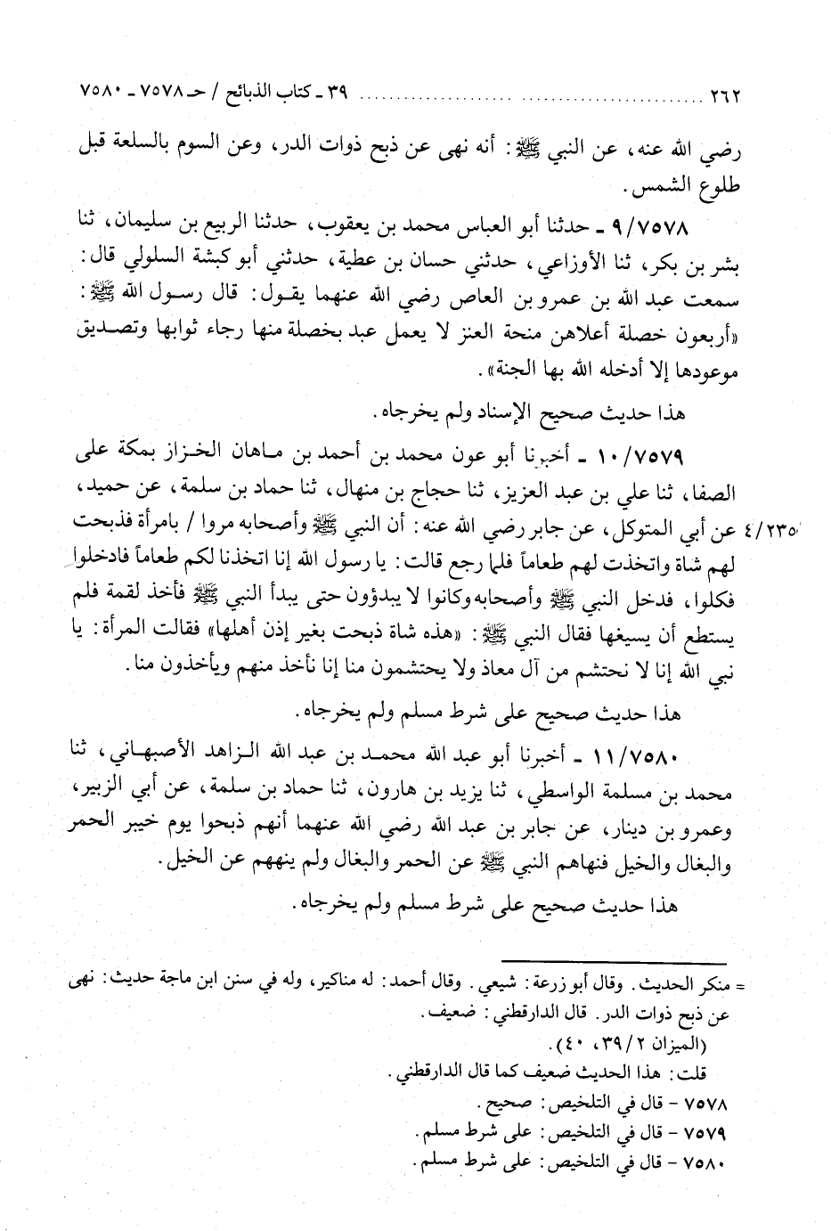 7580 - أَخْبَرَنَا أَبُو عَبْدِ اللَّهِ مُحَمَّدُ بْنُ عَبْدِ اللَّهِ الزَّاهِدُ الْأَصْبَهَانِيُّ، ثَنَا مُحَمَّدُ بْنُ مَسْلَمَةَ الْوَاسِطِيُّ، ثَنَا يَزِيدُ بْنُ هَارُونَ، ثَنَا حَمَّادُ بْنُ سَلَمَةَ، عَنْ أَبِي الزُّبَيْرِ، وَعَمْرِو بْنِ دِينَارٍ، عَنْ جَابِرِ بْنِ عَبْدِ اللَّهِ، رَضِيَ اللَّهُ عَنْهُمَا «أَنَّهُمْ ذَبَحُوا يَوْمَ خَيْبَرَ الْحُمُرَ وَالْبِغَالَ وَالْخَيْلَ §فَنَهَاهُمُ النَّبِيُّ صَلَّى اللهُ عَلَيْهِ وَسَلَّمَ عَنِ الْحُمُرِ وَالْبِغَالِ وَلَمْ يَنْهَهُمْ عَنِ الْخَيْلِ» هَذَا حَدِيثٌ صَحِيحٌ عَلَى شَرْطِ مُسْلِمٍ وَلَمْ يُخَرِّجَاهُ "K7580 - على شرط مسلم