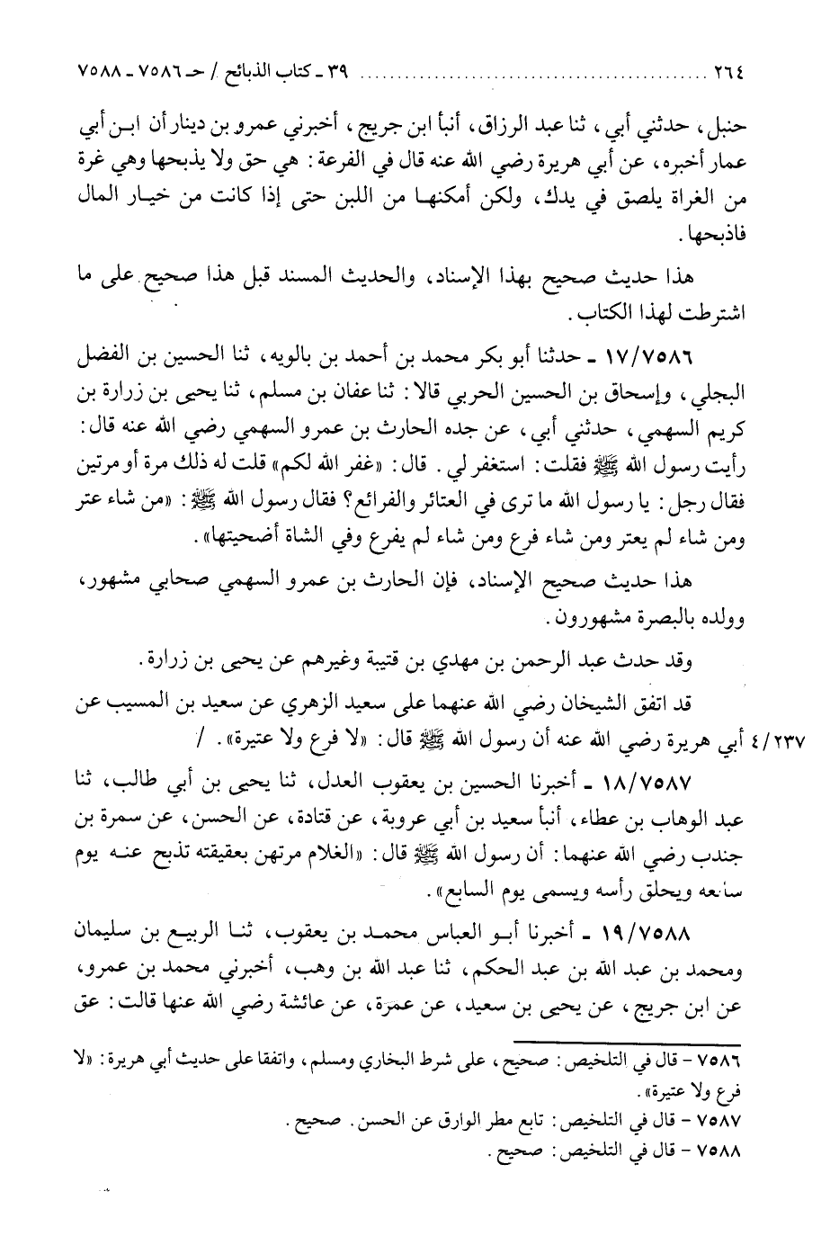 7586 - حَدَّثَنَا أَبُو بَكْرٍ مُحَمَّدُ بْنُ أَحْمَدَ بْنِ بَالَوَيْهِ، ثَنَا الْحُسَيْنُ بْنُ الْفَضْلِ الْبَجَلِيُّ، وَإِسْحَاقُ بْنُ الْحُسَيْنِ الْحَرْبِيُّ، قَالَا: ثَنَا عَفَّانُ بْنُ مُسْلِمٍ، ثَنَا يَحْيَى بْنُ زُرَارَةَ بْنِ كَرِيمٍ السَّهْمِيُّ، حَدَّثَنِي أَبِي، عَنْ جَدِّهِ الْحَارِثِ بْنِ عَمْرٍو السَّهْمِيِّ، رَضِيَ اللَّهُ عَنْهُ قَالَ: رَأَيْتُ رَسُولَ اللَّهِ صَلَّى اللهُ عَلَيْهِ وَسَلَّمَ فَقُلْتُ: اسْتَغْفِرْ لِي. قَالَ: «غَفَرَ اللَّهُ لَكُمْ» قُلْتُ لَهُ ذَلِكَ مَرَّةً أَوْ مَرَّتَيْنِ فَقَالَ رَجُلٌ: يَا رَسُولَ اللَّهِ مَا تَرَى فِي الْعَتَائِرِ وَالْفَرَائِعِ؟ فَقَالَ رَسُولُ اللَّهِ صَلَّى اللهُ عَلَيْهِ وَسَلَّمَ: «§مَنْ شَاءَ عَتَرَ وَمَنْ شَاءَ لَمْ يَعْتِرْ، وَمَنْ شَاءَ فَرَّعَ وَمَنْ شَاءَ لَمْ يُفَرِّعُ وَفِي الشَّاةِ أُضْحِيَّتُهَا» هَذَا حَدِيثٌ صَحِيحُ الْإِسْنَادِ، فَإِنَّ الْحَارِثَ بْنَ عَمْرٍو السَّهْمِيَّ صَحَابِيٌّ مَشْهُورٌ، وَوَلَدُهُ بِالْبَصْرَةِ مَشْهُورُونَ «وَقَدْ حَدَّثَ عَبْدُ الرَّحْمَنِ بْنُ مَهْدِيِّ بْنِ قُتَيْبَةَ، وَغَيْرُهُمْ عَنْ يَحْيَى بْنِ زُرَارَةَ،» قَدْ اتَّفَقَ الشَّيْخَانِ رَضِيَ اللَّهُ عَنْهُمَا عَلَى سَعِيدٍ الزُّهْرِيِّ، عَنْ سَعِيدِ بْنِ الْمُسَيَّبِ، عَنْ أَبِي هُرَيْرَةَ رَضِيَ اللَّهُ عَنْهُ أَنَّ رَسُولَ اللَّهِ صَلَّى اللهُ عَلَيْهِ وَسَلَّمَ قَالَ: «لَا فَرَعَ وَلَا عَتِيرَةَ» K7586 - صحيح على شرط البخاري ومسلم