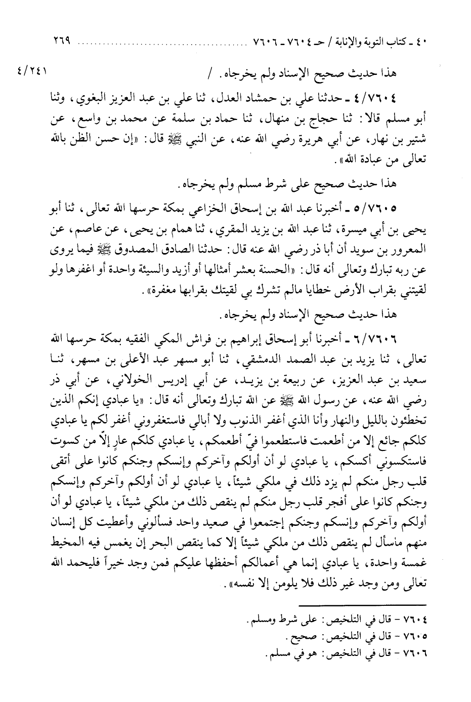 7606 - أَخْبَرَنَا أَبُو إِسْحَاقَ إِبْرَاهِيمُ بْنُ فِرَاسٍ الْمَكِّيُّ الْفَقِيهُ بِمَكَّةَ حَرَسَهَا اللَّهُ تَعَالَى، ثَنَا يَزِيدُ بْنُ عَبْدِ الصَّمَدِ الدِّمَشْقِيُّ، ثَنَا أَبُو مُسْهِرٍ عَبْدُ الْأَعْلَى بْنُ مُسْهِرٍ، ثَنَا سَعِيدُ بْنُ عَبْدِ الْعَزِيزِ، عَنْ رَبِيعَةَ بْنِ يَزِيدَ، عَنْ أَبِي إِدْرِيسَ الْخَوْلَانِيِّ، عَنْ أَبِي ذَرٍّ رَضِيَ اللَّهُ عَنْهُ، عَنْ رَسُولِ اللَّهِ صَلَّى اللهُ عَلَيْهِ وَسَلَّمَ، عَنِ اللَّهِ تَبَارَكَ وَتَعَالَى أَنَّهُ قَالَ: §«يَا عِبَادِي إِنَّكُمُ الَّذِينَ تُخْطِئُونَ بِاللَّيْلِ وَالنَّهَارِ وَأَنَا الَّذِي أَغْفِرُ الذُّنُوبَ وَلَا أُبَالِي فَاسْتَغْفِرُونِي أَغْفِرْ لَكُمْ، يَا عِبَادِي كُلُّكُمْ جَائِعٌ إِلَّا مَنْ أَطْعَمْتُ فَاسْتَطْعِمُوا فِيَّ أُطْعِمْكُمْ، يَا عِبَادِي كُلُّكُمْ عَارٍ إِلَّا مَنْ كَسَوْتُ فَاسْتَكْسُونِي أَكْسُكُمْ، يَا عِبَادِي لَوْ أَنَّ أَوَّلَكُمْ وَآخِرَكُمْ وَإِنْسَكُمْ وَجِنَّكُمْ كَانُوا عَلَى أَتْقَى قَلْبِ رَجُلٍ مِنْكُمْ لَمْ يَزِدْ ذَلِكَ فِي مُلْكِي شَيْئًا، يَا عِبَادِي لَوْ أَنَّ أَوَّلَكُمْ وَآخِرَكُمْ وَإِنْسَكُمْ وَجِنَّكُمْ كَانُوا عَلَى أَفْجَرِ قَلْبِ رَجُلٍ مِنْكُمْ لَمْ يُنْقِصْ ذَلِكَ مِنْ مُلْكِي شَيْئًا، يَا عِبَادِي لَوْ أَنَّ أَوَّلَكُمْ وَآخِرَكُمْ وَإِنْسَكُمْ وَجِنَّكُمُ اجْتَمَعُوا فِي صَعِيدٍ وَاحِدٍ فَسَأَلُونِي وَأَعْطَيْتُ كُلَّ إِنْسَانٍ مِنْهُمْ مَا سَأَلَ لَمْ يُنْقِصْ ذَلِكَ مِنْ مُلْكِي شَيْئًا إِلَّا كَمَا يَنْقُصُ الْبَحْرُ إِنْ يُغْمَسْ فِيهِ الْمِخْيَطُ غَمْسَةً وَاحِدَةً، يَا عِبَادِي إِنَّمَا هِيَ أَعْمَالُكُمْ أَحْفَظُهَا عَلَيْكُمْ فَمَنْ وَجَدَ خَيْرًا فَلْيَحْمَدِ اللَّهَ تَعَالَى وَمَنْ وَجَدَ غَيْرَ ذَلِكَ فَلَا يَلُومَنَّ إِلَّا نَفْسَهُ» هَذَا حَدِيثٌ صَحِيحٌ عَلَى شَرْطِ الشَّيْخَيْنِ وَلَمْ يُخَرِّجَاهُ بِهَذِهِ السِّيَاقَةِ "K7606 - هو في مسلم