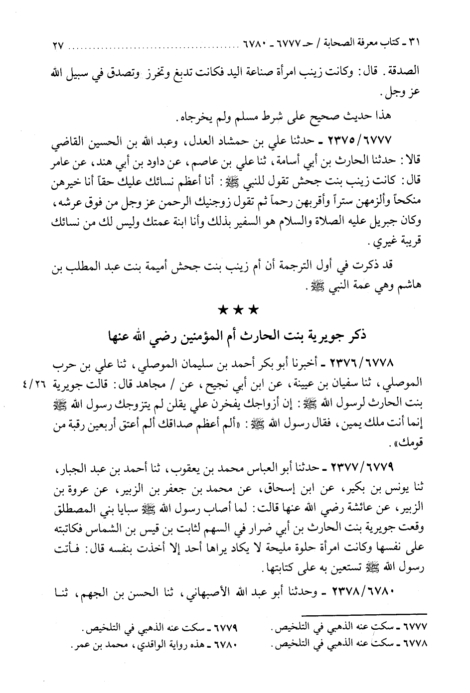 6777 - حَدَّثَنَا عَلِيُّ بْنُ حَمْشَاذٍ الْعَدْلُ، وَعَبْدُ اللَّهِ بْنُ الْحُسَيْنِ الْقَاضِي، قَالَا: حَدَّثَنَا الْحَارِثُ بْنُ أَبِي أُسَامَةَ، ثنا عَلِيُّ بْنُ عَاصِمٍ، عَنْ دَاودَ بْنِ أَبِي هِنْدٍ، عَنْ عَامِرٍ، قَالَ: كَانَتْ زَيْنَبُ بِنْتُ جَحْشٍ، تَقُولُ لِلنَّبِيِّ صَلَّى اللهُ عَلَيْهِ وَسَلَّمَ: " §أَنَا أَعْظَمُ نِسَائِكَ عَلَيْكَ حَقًّا، أَنَا خَيْرُهُنَّ مَنْكَحًا وَأَلْزَمُهُنَّ سِتْرًا وَأَقْرَبُهُنَّ رَحِمًا، ثُمَّ تَقُولُ: زَوَّجَنِيكَ الرَّحْمَنُ عَزَّ وَجَلَّ مِنْ فَوْقِ عَرْشِهِ، وَكَانَ جِبْرِيلُ عَلَيْهِ الصَّلَاةُ وَالسَّلَامُ هُوَ السَّفِيرُ بِذَلِكَ، وَأَنَا ابْنَةُ عَمَّتِكَ وَلَيْسَ لَكَ مِنْ نِسَائِكَ قَرِيبَةً غَيْرِي «قَدْ ذَكَرْتُ فِي أَوَّلِ التَّرْجَمَةِ أَنَّ أُمَّ زَيْنَبَ بِنْتِ جَحْشٍ أُمَيْمَةُ بِنْتُ عَبْدِ الْمُطَّلِبِ بْنِ هَاشِمٍ وَهِيَ عَمَّةُ النَّبِيِّ صَلَّى اللهُ عَلَيْهِ وَسَلَّمَ» K6777 - سكت عنه الذهبي في التلخيص