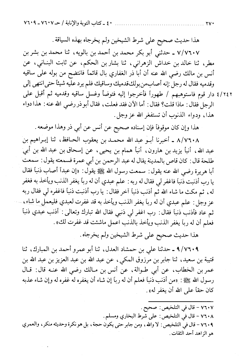 7609 - حَدَّثَنَا عَلِيُّ بْنُ حَمْشَاذَ الْعَدْلُ، ثَنَا أَبُو عَمْرٍو أَحْمَدُ بْنُ الْمُبَارَكِ، ثَنَا قُتَيْبَةُ بْنُ سَعِيدٍ، ثَنَا جَابِرُ بْنُ مَرْزُوقٍ الْمَكِّيُّ، عَنْ عَبْدِ اللَّهِ بْنِ عَبْدِ الْعَزِيزِ بْنِ عَبْدِ اللَّهِ بْنِ عُمَرَ بْنِ الْخَطَّابِ، عَنْ أَبِي طُوَالَةَ، عَنْ أَنَسِ بْنِ مَالِكٍ، رَضِيَ اللَّهُ عَنْهُ قَالَ: قَالَ رَسُولُ اللَّهِ صَلَّى اللهُ عَلَيْهِ وَسَلَّمَ: §«مَنْ أَذْنَبَ ذَنْبًا فَعَلِمَ أَنَّ لَهُ رَبًّا إِنْ شَاءَ أَنْ يَغْفِرَهُ لَهُ غَفَرَهُ لَهُ وَإِنْ شَاءَ عَذَّبَهُ كَانَ حَقًّا عَلَى اللَّهِ أَنْ يَغْفِرَ لَهُ» هَذَا حَدِيثٌ صَحِيحُ الْإِسْنَادِ وَلَمْ يُخَرِّجَاهُ "K7609 - لا والله ومن جابر حتى يكون حجة بل هو نكرة وحديثه منكر والعمري هو الزاهد أحد الثقات