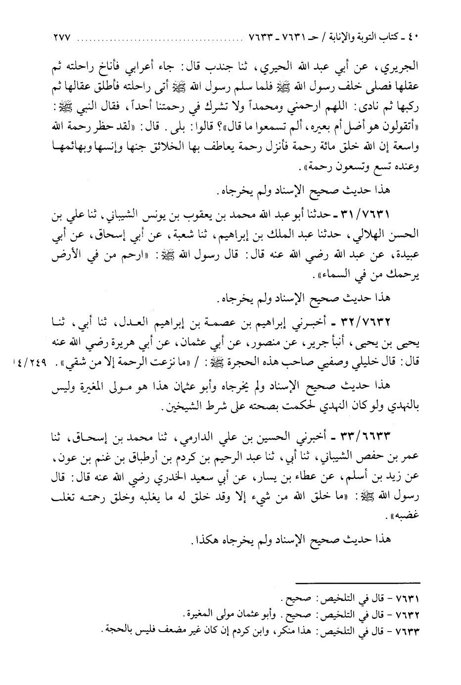 7631 - حَدَّثَنَا أَبُو عَبْدِ اللَّهِ مُحَمَّدُ بْنُ يَعْقُوبَ بْنِ يُونُسَ الشَّيْبَانِيُّ، ثَنَا عَلِيُّ بْنُ الْحَسَنِ الْهِلَالِيُّ، حَدَّثَنَا عَبْدُ الْمَلِكِ بْنِ إِبْرَاهِيمَ، ثَنَا شُعْبَةُ، عَنْ أَبِي إِسْحَاقَ، عَنْ أَبِي عُبَيْدَةَ، عَنْ عَبْدِ اللَّهِ، رَضِيَ اللَّهُ عَنْهُ قَالَ: قَالَ رَسُولُ اللَّهِ صَلَّى اللهُ عَلَيْهِ وَسَلَّمَ: §«ارْحَمْ مَنْ فِي الْأَرْضِ يَرْحَمْكَ مَنْ فِي السَّمَاءِ» هَذَا حَدِيثٌ صَحِيحُ الْإِسْنَادِ وَلَمْ يُخَرِّجَاهُ "K7631 - صحيح