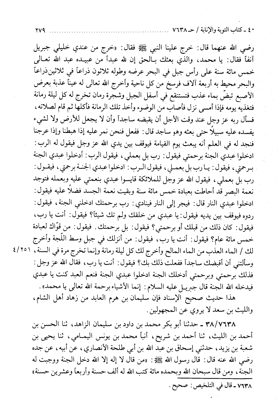 7638 - حَدَّثَنَا أَبُو بَكْرٍ مُحَمَّدُ بْنُ دَاوُدَ بْنِ سُلَيْمَانَ الزَّاهِدُ، ثَنَا الْحَسَنُ بْنُ أَحْمَدَ بْنِ اللَّيْثِ، ثَنَا أَحْمَدُ بْنُ شُرَيْحٍ، أَنْبَأَ مُحَمَّدُ بْنُ يُونُسَ الْيَمَامِيُّ، ثَنَا يَحْيَى بْنُ شُعْبَةَ بْنِ يَزِيدَ، حَدَّثَنِي إِسْحَاقُ بْنُ عَبْدِ اللَّهِ بْنِ أَبِي طَلْحَةَ الْأَنْصَارِيُّ، عَنْ أَبِيهِ، عَنْ جَدِّهِ، رَضِيَ اللَّهُ عَنْهُ قَالَ: قَالَ رَسُولُ اللَّهِ صَلَّى اللهُ عَلَيْهِ وَسَلَّمَ: " §مَنْ قَالَ: لَا إِلَهَ إِلَّا اللَّهُ دَخَلَ الْجَنَّةَ وَوَجَبَتْ لَهُ الْجَنَّةُ، وَمَنْ قَالَ: سُبْحَانَ اللَّهِ وَبِحَمْدِهِ مِائَةُ كَتَبَ اللَّهُ لَهُ أَلْفَ حَسَنَةٍ وَأَرْبَعًا وَعِشْرِينَ حَسَنَةً " قَالُوا: يَا رَسُولَ اللَّهِ، إِذًا لَا يَهْلِكُ مِنَّا أَحَدٌ. قَالَ: «بَلَى إِنَّ أَحَدَكُمْ لَيَجِيءُ بِالْحَسَنَاتِ لَوْ وُضِعَتْ عَلَى جَبَلٍ أَثْقَلَتْهُ ثُمَّ تَجِيءُ النِّعَمُ فَتَذْهَبُ بِتِلْكَ ثُمَّ يَتَطَاوَلُ الرَّبُّ بَعْدَ ذَلِكَ بِرَحْمَتِهِ» هَذَا حَدِيثٌ صَحِيحُ الْإِسْنَادِ شَاهِدٌ لِحَدِيثِ سُلَيْمَانَ بْنِ هَرِمٍ وَلَمْ يُخَرِّجَاهُK7638 - صحيح