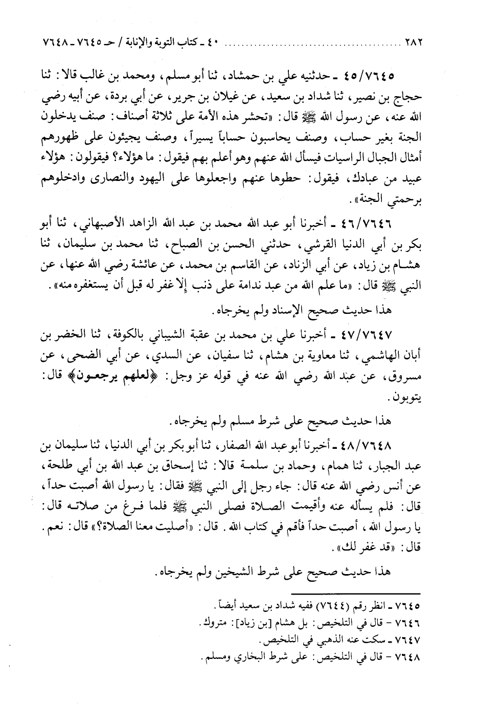 7648 - أَخْبَرَنَا أَبُو عَبْدِ اللَّهِ الصَّفَّارُ، ثَنَا أَبُو بَكْرِ بْنُ أَبِي الدُّنْيَا، ثَنَا سُلَيْمَانُ بْنُ عَبْدِ الْجَبَّارِ، ثَنَا هَمَّامٌ، وَحَمَّادُ بْنُ سَلَمَةَ، قَالَا: ثَنَا إِسْحَاقُ بْنُ عَبْدِ اللَّهِ بْنِ أَبِي طَلْحَةَ، عَنْ أَنَسٍ، رَضِيَ اللَّهُ عَنْهُ، قَالَ: جَاءَ رَجُلٌ إِلَى النَّبِيِّ صَلَّى اللهُ عَلَيْهِ وَسَلَّمَ، فَقَالَ: يَا رَسُولَ اللَّهِ، أَصَبْتُ حَدًّا، قَالَ: فَلَمْ يَسْأَلْهُ عَنْهُ وَأُقِيمَتِ الصَّلَاةُ، فَصَلَّى النَّبِيُّ صَلَّى اللهُ عَلَيْهِ وَسَلَّمَ فَلَمَّا فَرَغَ مِنْ صَلَاتِهِ، قَالَ: يَا رَسُولَ اللَّهِ، أَصَبْتُ حَدًّا فَأَقِمْ فِيَّ كِتَابَ اللَّهِ. قَالَ: «§أَصَلَّيْتَ مَعَنَا الصَّلَاةَ؟» قَالَ: نَعَمْ. قَالَ: «قَدْ غُفِرَ لَكَ» هَذَا حَدِيثٌ صَحِيحٌ عَلَى شَرْطِ الشَّيْخَيْنِ وَلَمْ يُخَرِّجَاهُ "K7648 - على شرط البخاري ومسلم