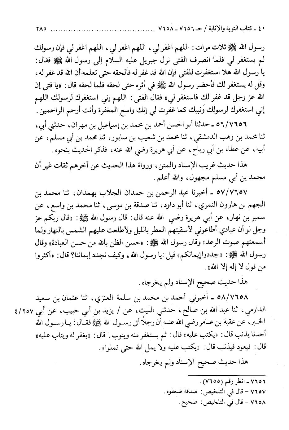 7658 - أَخْبَرَنِي أَحْمَدُ بْنُ مُحَمَّدِ بْنِ سَلَمَةَ الْعَنَزِيُّ، ثَنَا عُثْمَانُ بْنُ سَعِيدٍ الدَّارِمِيُّ، ثَنَا عَبْدُ اللَّهِ بْنُ صَالِحٍ، حَدَّثَنِي اللَّيْثُ، عَنْ يَزِيدَ بْنِ أَبِي حَبِيبٍ، عَنْ أَبِي الْخَيْرِ، عَنْ عُقْبَةَ بْنِ عَامِرٍ، رَضِيَ اللَّهُ عَنْهُ، أَنَّ رَجُلًا أَتَى رَسُولَ اللَّهِ صَلَّى اللهُ عَلَيْهِ وَسَلَّمَ فَقَالَ: يَا رَسُولَ اللَّهِ، §أَحَدُنَا يُذْنِبُ، قَالَ: «يُكْتَبُ عَلَيْهِ» قَالَ: ثُمَّ يَسْتَغْفِرُ مِنْهُ وَيَتُوبُ؟ قَالَ: «يُغْفَرُ لَهُ وَيُتَابُ عَلَيْهِ» قَالَ: فَيَعُودُ فَيُذْنِبُ؟ قَالَ: «يُكْتَبُ عَلَيْهِ، وَلَا يَمَلُّ اللَّهُ حَتَّى تَمَلُّوا» هَذَا حَدِيثٌ صَحِيحُ الْإِسْنَادِ وَلَمْ يُخَرِّجَاهُ "K7658 - صحيح