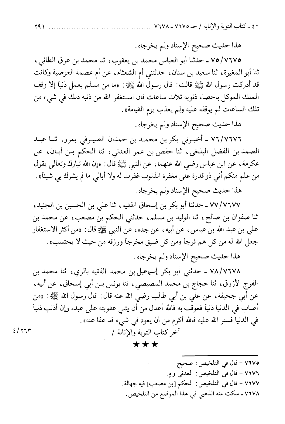 7678 - حَدَّثَنِي أَبُو بَكْرٍ إِسْمَاعِيلُ بْنُ مُحَمَّدٍ الْفَقِيهُ بِالرَّيِّ، ثَنَا مُحَمَّدُ بْنُ الْفَرَجِ الْأَزْرَقُ، ثَنَا حَجَّاجُ بْنُ مُحَمَّدٍ الْمِصِّيصِيُّ، ثَنَا يُونُسُ بْنُ أَبِي إِسْحَاقَ، عَنْ أَبِيهِ، عَنْ أَبِي جُحَيْفَةَ، عَنْ عَلِيِّ بْنِ أَبِي طَالِبٍ، رَضِيَ اللَّهُ عَنْهُ قَالَ: قَالَ رَسُولُ اللَّهِ صَلَّى اللهُ عَلَيْهِ وَسَلَّمَ: §«مَنْ أَصَابَ فِي الدُّنْيَا ذَنْبًا فَعُوقِبَ بِهِ فَاللَّهُ أَعْدَلُ مِنْ أَنْ يُثَنِّيَ عُقُوبَتَهُ عَلَى عَبْدِهِ، وَإِنْ أَذْنَبَ ذَنْبًا فِي الدُّنْيَا فَسَتَرَ اللَّهُ عَلَيْهِ فَاللَّهُ أَكْرَمُ مِنْ أَنْ يَعُودَ فِي شَيْءٍ قَدْ عَفَا عَنْهُ» آخِرُ كِتَابِ التَّوْبَةِ وَالْإِنَابَةِ "K7678 - سكت عنه الذهبي هنا ويأتي برقم 8165 وقال الذهبي هناك: على شرط البخاري ومسلم