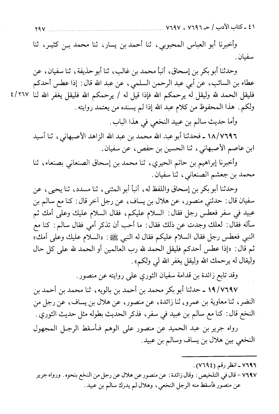 7696 - فَحَدَّثَنَا أَبُو عَبْدِ اللَّهِ مُحَمَّدُ بْنُ عَبْدِ اللَّهِ الزَّاهِدُ الْأَصْبَهَانِيُّ، ثَنَا أُسَيْدُ بْنُ عَاصِمٍ الْأَصْبَهَانِيُّ، ثَنَا الْحُسَيْنُ بْنُ حَفْصٍ، عَنْ سُفْيَانَ، وَأَخْبَرَنَا إِبْرَاهِيمُ بْنُ حَاتِمٍ الْحِيرِيُّ، ثَنَا مُحَمَّدُ بْنُ إِسْحَاقَ الصَّنْعَانِيُّ، بِصَنْعَاءَ، ثَنَا مُحَمَّدُ بْنُ جُعْشُمٍ الصَّنْعَانِيُّ، ثَنَا سُفْيَانُ، وَحَدَّثَنَا أَبُو بَكْرِ بْنُ إِسْحَاقَ، وَاللَّفْظُ لَهُ، أَنْبَأَ أَبُو الْمُثَنَّى، ثَنَا مُسَدَّدٌ، ثَنَا يَحْيَى، عَنْ سُفْيَانَ، قَالَ: حَدَّثَنِي مَنْصُورٌ، عَنْ هِلَالِ بْنِ يَسَافٍ، عَنْ رَجُلٍ، آخَرَ قَالَ: كُنَّا مَعَ سَالِمِ بْنِ عُبَيْدٍ، فِي سَفَرٍ فَعَطَسَ رَجُلٌ فَقَالَ: السَّلَامُ عَلَيْكُمْ، فَقَالَ: السَّلَامُ عَلَيْكَ وَعَلَى أُمِّكَ ثُمَّ سَأَلَهُ فَقَالَ: لَعَلَّكَ وَجَدْتَ عَنْ ذَلِكَ، فَقَالَ: مَا أُحِبُّ أَنْ تَذْكُرَ أُمِّي فَقَالَ سَالِمٌ: كُنَّا مَعَ النَّبِيِّ فَعَطَسَ رَجُلٌ فَقَالَ: السَّلَامُ عَلَيْكُمْ، فَقَالَ لَهُ النَّبِيُّ صَلَّى اللهُ عَلَيْهِ وَسَلَّمَ: «§السَّلَامُ عَلَيْكَ وَعَلَى أُمِّكَ» ثُمَّ قَالَ: " إِذَا عَطَسَ أَحَدُكُمْ فَلْيَقُلِ: الْحَمْدُ لِلَّهِ رَبِّ الْعَالَمِينَ أَوِ الْحَمْدُ لِلَّهِ عَلَى كُلِّ حَالٍ وَلْيُقَلْ لَهُ: يَرْحَمُكَ اللَّهُ وَلْيَقُلْ: يَغْفِرُ اللَّهُ لِي وَلَكُمْ " وَقَدْ تَابَعَ زَائِدَةُ بْنُ قُدَامَةَ، سُفْيَانَ الثَّوْرِيَّ، عَلَى رِوَايَتِهِ عَنْ مَنْصُورٍ،