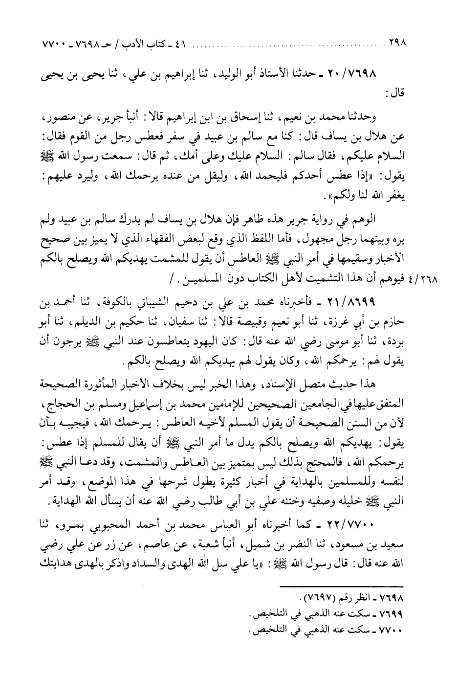 7698 - حَدَّثَنَا الْأُسْتَاذُ أَبُو الْوَلِيدِ، ثَنَا إِبْرَاهِيمُ بْنُ عَلِيٍّ، ثَنَا يَحْيَى بْنُ يَحْيَى، قَالَ: وَحَدَّثَنَا مُحَمَّدُ بْنُ نُعَيْمٍ، ثَنَا إِسْحَاقُ بْنُ إِبْرَاهِيمَ، قَالَا: أَنْبَأَ جَرِيرٌ، عَنْ مَنْصُورٍ، عَنْ هِلَالِ بْنِ يَسَافٍ، قَالَ: كُنَّا مَعَ سَالِمِ بْنِ عُبَيْدٍ، فِي سَفَرٍ فَعَطَسَ رَجُلٌ مِنَ الْقَوْمِ فَقَالَ: السَّلَامُ عَلَيْكُمْ، فَقَالَ سَالِمٌ: السَّلَامُ عَلَيْكَ وَعَلَى أُمِّكَ، ثُمَّ قَالَ: سَمِعْتُ رَسُولَ اللَّهِ صَلَّى اللهُ عَلَيْهِ وَسَلَّمَ يَقُولُ: " إِذَا §عَطَسَ أَحَدُكُمْ فَلْيَحْمَدِ اللَّهَ وَلْيَقُلْ مَنْ عِنْدَهُ: يَرْحَمُكَ اللَّهُ، وَلْيَرُدَّ عَلَيْهِمْ: يَغْفِرُ اللَّهُ لَنَا وَلَكُمُ " الْوَهْمُ فِي رِوَايَةِ جَرِيرٍ هَذِهِ ظَاهِرٌ فَإِنَّ هِلَالَ بْنَ يَسَافٍ لَمْ يُدْرِكْ سَالِمَ بْنَ عُبَيْدٍ وَلَمْ يَرَهُ وَبَيْنَهُمَا رَجُلٌ مَجْهُولٌ، فَأَمَّا اللَّفْظُ الَّذِي وَقَعَ لِبَعْضِ الْفُقَهَاءِ الَّذِي لَا يُمَيِّزُ بَيْنَ صَحِيحِ الْأَخْبَارِ وَسَقِيمِهَا فِي أَمْرِ النَّبِيِّ صَلَّى اللهُ عَلَيْهِ وَسَلَّمَ الْعَاطِسُ أَنْ يَقُولَ لِلْمُشَمِّتِ: يَهْدِيكُمُ اللَّهُ وَيُصْلِحُ بَالَكُمْ فَيُوهَمُ أَنَّ هَذَا التَّشْمِيتَ لِأَهْلِ الْكِتَابِ دُونَ الْمُسْلِمِينَ "
