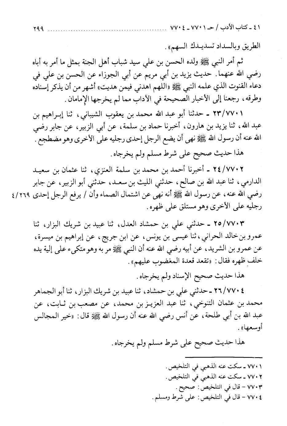 7701 - حَدَّثَنَا أَبُو عَبْدِ اللَّهِ مُحَمَّدُ بْنُ يَعْقُوبَ الشَّيْبَانِيُّ، ثَنَا إِبْرَاهِيمُ بْنُ عَبْدِ اللَّهِ، ثَنَا يَزِيدُ بْنُ هَارُونَ، أَخْبَرَنَا حَمَّادُ بْنُ سَلَمَةَ، عَنْ أَبِي الزُّبَيْرِ، عَنْ جَابِرٍ، رَضِيَ اللَّهُ عَنْهُ «أَنَّ رَسُولَ اللَّهِ صَلَّى اللهُ عَلَيْهِ وَسَلَّمَ §نَهَى أَنْ يَضَعَ الرَّجُلُ إِحْدَى رِجْلَيْهِ عَلَى الْأُخْرَى وَهُوَ مُضْطَجِعٌ» هَذَا حَدِيثٌ صَحِيحٌ عَلَى شَرْطِ مُسْلِمٍ وَلَمْ يُخَرِّجَاهُ "K7701 - سكت عنه الذهبي في التلخيص