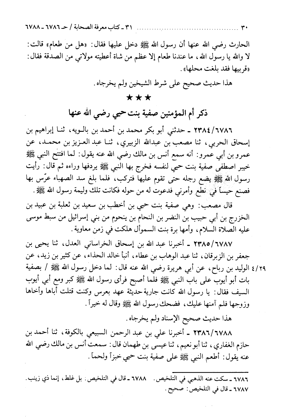 6788 - أَخْبَرَنَا عَلِيُّ بْنُ عَبْدِ الرَّحْمَنِ السَّبِيعِيُّ، بِالْكُوفَةِ، ثنا أَحْمَدُ بْنُ حَازِمٍ الْغِفَارِيُّ، ثنا أَبُو نُعَيْمٍ، ثنا عِيسَى بْنُ طَهْمَانَ، قَالَ: سَمِعْتُ أَنَسَ بْنَ مَالِكٍ، رَضِيَ اللَّهُ عَنْهُ يَقُولُ: §«أَطْعَمَ النَّبِيُّ صَلَّى اللهُ عَلَيْهِ وَسَلَّمَ عَلَى صَفِيَّةَ بِنْتِ حُيَيٍّ خُبْزًا وَلَحْمًا» هَذَا حَدِيثٌ صَحِيحُ الْإِسْنَادِ وَلَمْ يُخَرِّجَاهُ "K6788 - بل غلط إنما ذي زينب