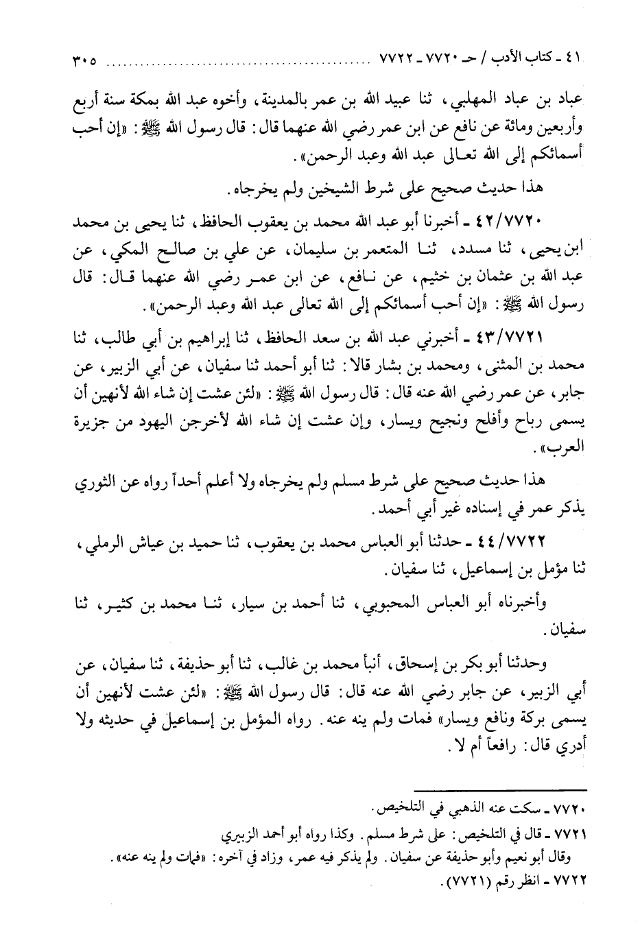 7720 - أَخْبَرَنَا أَبُو عَبْدِ اللَّهِ مُحَمَّدُ بْنُ يَعْقُوبَ الْحَافِظُ، ثَنَا يَحْيَى بْنُ مُحَمَّدِ بْنِ يَحْيَى، ثَنَا مُسَدَّدٌ، ثَنَا الْمُعْتَمِرُ بْنُ سُلَيْمَانَ، عَنْ عَلِيِّ بْنِ صَالِحٍ الْمَكِّيُّ، عَنْ عَبْدِ اللَّهِ بْنِ عُثْمَانَ بْنِ خُثَيْمٍ، عَنْ نَافِعٍ، عَنِ ابْنِ عُمَرَ، رَضِيَ اللَّهُ عَنْهُمَا قَالَ: قَالَ رَسُولُ اللَّهِ صَلَّى اللهُ عَلَيْهِ وَسَلَّمَ: «إِنَّ §أَحَبَّ أَسْمَائِكُمْ إِلَى اللَّهِ تَعَالَى عَبْدُ اللَّهِ وَعَبْدُ الرَّحْمَنِ» K7720 - سكت عنه الذهبي في التلخيص