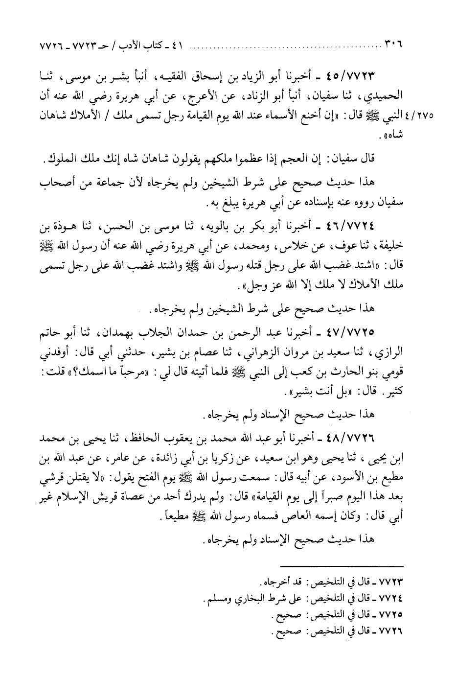 7723 - أَخْبَرَنَا أَبُو الزَّيَّادِ بْنُ إِسْحَاقَ الْفَقِيهُ، أَنْبَأَ بِشْرُ بْنُ مُوسَى، ثَنَا الْحُمَيْدِيُّ، ثَنَا سُفْيَانُ، أَنْبَأَ أَبُو الزِّنَادِ، عَنِ الْأَعْرَجِ، عَنْ أَبِي هُرَيْرَةَ، رَضِيَ اللَّهُ عَنْهُ أَنَّ النَّبِيَّ صَلَّى اللهُ عَلَيْهِ وَسَلَّمَ قَالَ: «إِنَّ §أَخْنَعَ الْأَسْمَاءِ عِنْدَ اللَّهِ يَوْمَ الْقِيَامَةِ رَجُلٌ تَسَمَّى مَلِكَ الْأَمْلَاكِ شَاهَانْ شَاهْ» قَالَ سُفْيَانُ: " إِنَّ الْعَجَمَ إِذَا عَظَّمُوا مَلِكَهُمْ يَقُولُونَ شَاهَانْ شَاهْ: إِنَّكَ مَلِكُ الْمُلُوكِ «هَذَا حَدِيثٌ صَحِيحٌ عَلَى شَرْطِ الشَّيْخَيْنِ وَلَمْ يُخَرِّجَاهُ لِأَنَّ جَمَاعَةً مِنْ أَصْحَابِ سُفْيَانَ رَوَوْهُ عَنْهُ بِإِسْنَادِهِ عَنْ أَبِي هُرَيْرَةَ يَبْلُغُ بِهِ» K7723 - قد أخرجاه