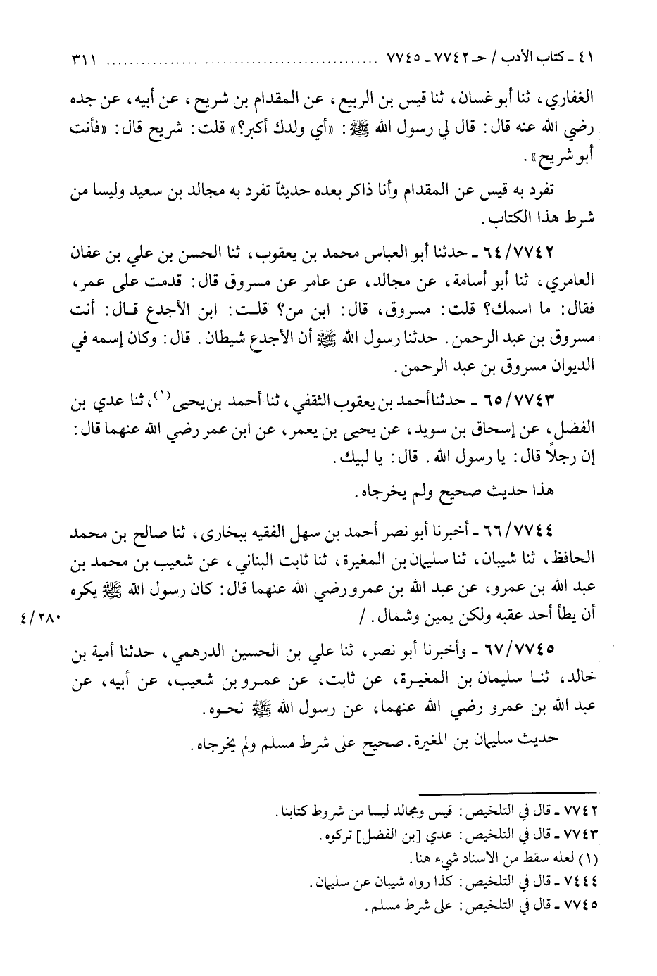 7745 - وَأَخْبَرَنَا أَبُو نَصْرٍ، ثَنَا عَلِيُّ بْنُ الْحُسَيْنِ الدِّرْهَمِيُّ، حَدَّثَنَا أُمَيَّةُ بْنُ خَالِدٍ، ثَنَا سُلَيْمَانُ بْنُ الْمُغِيرَةِ، عَنْ ثَابِتٍ، عَنْ عَمْرِو بْنِ شُعَيْبٍ، عَنْ أَبِيهِ، عَنْ عَبْدِ اللَّهِ بْنِ عَمْرٍو، رَضِيَ اللَّهُ عَنْهُمَا عَنْ رَسُولِ اللَّهِ صَلَّى اللهُ عَلَيْهِ وَسَلَّمَ نَحْوَهُ حَدِيثُ سُلَيْمَانَ بْنِ الْمُغِيرَةِ «صَحِيحٌ عَلَى شَرْطِ مُسْلِمٍ وَلَمْ يُخَرِّجَاهُ» K7745 - على شرط مسلم