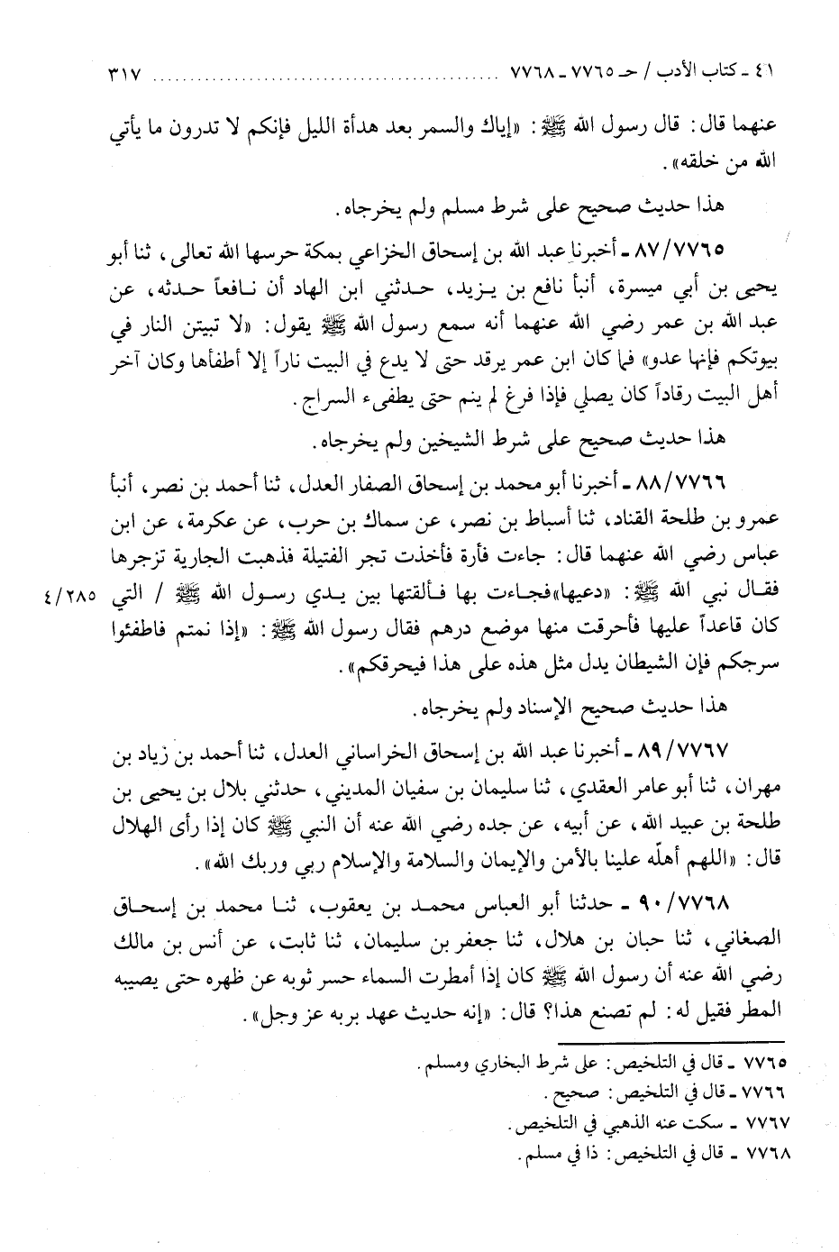 7765 - أَخْبَرَنَا عَبْدُ اللَّهِ بْنُ إِسْحَاقَ الْخُزَاعِيُّ، بِمَكَّةَ حَرَسَهَا اللَّهُ تَعَالَى، ثَنَا أَبُو يَحْيَى بْنُ أَبِي مَسَرَّةَ، أَنْبَأَ نَافِعُ بْنُ يَزِيدَ، حَدَّثَنِي ابْنُ الْهَادِ، أَنَّ نَافِعًا، حَدَّثَهُ عَنْ عَبْدِ اللَّهِ بْنِ عُمَرَ، رَضِيَ اللَّهُ عَنْهُمَا أَنَّهُ سَمِعَ رَسُولَ اللَّهِ صَلَّى اللهُ عَلَيْهِ وَسَلَّمَ يَقُولُ: §«لَا تَبِيتَنَّ النَّارُ فِي بُيُوتِكُمْ فَإِنَّهَا عَدُوٌّ» فَمَا كَانَ ابْنُ عُمَرَ، يَرْقُدُ حَتَّى لَا يَدَعَ فِي الْبَيْتِ نَارًا إِلَّا أَطْفَأَهَا وَكَانَ آخِرَ أَهْلِ الْبَيْتِ رُقَادًا كَانَ يُصَلِّي، فَإِذَا فَرَغَ لَمْ يَنَمْ حَتَّى يُطْفِئَ السِّرَاجَ «هَذَا حَدِيثٌ صَحِيحٌ عَلَى شَرْطِ الشَّيْخَيْنِ وَلَمْ يُخَرِّجَاهُ» K7765 - على شرط البخاري ومسلم