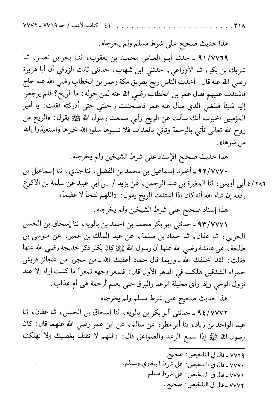 7770 - أَخْبَرَنَا إِسْمَاعِيلُ بْنُ مُحَمَّدِ بْنِ الْفَضْلِ، ثَنَا جَدِّي، ثَنَا إِسْمَاعِيلُ بْنُ أَبِي أُوَيْسٍ، ثَنَا الْمُغِيرَةُ بْنُ عَبْدِ الرَّحْمَنِ، عَنْ يَزِيدَ بْنِ أَبِي عُبَيْدٍ، عَنْ سَلَمَةَ بْنِ الْأَكْوَعِ، رَفَعَهُ إِنْ شَاءَ اللَّهُ أَنَّهُ كَانَ §إِذَا اشْتَدَّتِ الرِّيحُ يَقُولُ: «اللَّهُمَّ لَقْحًا لَا عَقِيمًا» هَذَا إِسْنَادٌ صَحِيحٌ عَلَى شَرْطِ الشَّيْخَيْنِ وَلَمْ يُخَرِّجَاهُ "K7770 - على شرط البخاري ومسلم