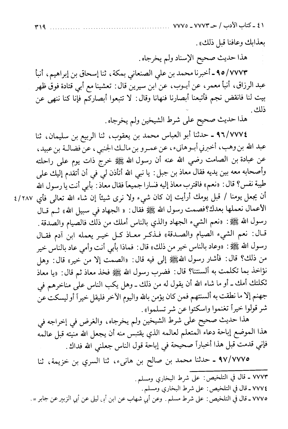 7774 - حَدَّثَنَا أَبُو الْعَبَّاسِ مُحَمَّدُ بْنُ يَعْقُوبَ، ثَنَا الرَّبِيعُ بْنُ سُلَيْمَانَ، ثَنَا عَبْدُ اللَّهِ بْنُ وَهْبٍ، أَخْبَرَنِي أَبُو هَانِئٍ، عَنْ عَمْرِو بْنِ مَالِكٍ الْجَنْبِيِّ، عَنْ فَضَالَةَ بْنِ عُبَيْدٍ، عَنْ عُبَادَةَ بْنِ الصَّامِتِ، رَضِيَ اللَّهُ عَنْهُ أَنَّ رَسُولَ اللَّهِ صَلَّى اللهُ عَلَيْهِ وَسَلَّمَ خَرَجَ ذَاتَ يَوْمٍ عَلَى رَاحِلَتِهِ وَأَصْحَابُهُ مَعَهُ بَيْنَ يَدَيْهِ، فَقَالَ مُعَاذُ بْنُ جَبَلٍ: يَا نَبِيَّ اللَّهِ أَتَأْذَنُ لِي فِي أَنْ أَتَقَدَّمَ إِلَيْكَ عَلَى طِيبَةِ نَفْسٍ؟ قَالَ: «نَعَمْ» فَاقْتَرَبَ مُعَاذٌ إِلَيْهِ فَسَارَا جَمِيعًا، فَقَالَ مُعَاذٌ: بِأَبِي أَنْتَ يَا رَسُولَ اللَّهِ، أَنْ يَجْعَلَ يَوْمَنَا قَبْلَ يَوْمِكَ أَرَأَيْتَ إِنْ كَانَ شَيْءٌ وَلَا نَرَى شَيْئًا إِنْ شَاءَ اللَّهُ تَعَالَى فَأَيُّ الْأَعْمَالِ نَعْمَلَهَا بَعْدَكَ؟ فَصَمَتَ رَسُولُ اللَّهِ صَلَّى اللهُ عَلَيْهِ وَسَلَّمَ فَقَالَ: «الْجِهَادُ فِي سَبِيلِ اللَّهِ» ثُمَّ قَالَ رَسُولُ اللَّهِ صَلَّى اللهُ عَلَيْهِ وَسَلَّمَ: «§نِعْمَ الشَّيْءُ الْجِهَادُ، وَالَّذِي بِالنَّاسِ أَمْلَكُ مِنْ ذَلِكَ فَالصِّيَامُ وَالصَّدَقَةُ» قَالَ: «نِعْمَ الشَّيْءُ الصِّيَامُ وَالصَّدَقَةُ» فَذَكَرَ مُعَاذٌ كُلَّ خَيْرٍ يَعْمَلُهُ ابْنُ آدَمَ فَقَالَ رَسُولُ اللَّهِ صَلَّى اللهُ عَلَيْهِ وَسَلَّمَ: «وَعَادِ بِالنَّاسِ خَيْرٌ مِنْ ذَلِكَ» قَالَ: فَمَاذَا بِأَبِي أَنْتَ وَأُمِّي عَادِ بِالنَّاسِ خَيْرٌ مِنْ ذَلِكَ؟ قَالَ: فَأَشَارَ رَسُولُ اللَّهِ صَلَّى اللهُ عَلَيْهِ وَسَلَّمَ إِلَى فِيهِ قَالَ: «الصَّمْتُ إِلَّا مِنْ خَيْرٍ» قَالَ: وَهَلْ نُؤَاخَذُ بِمَا تَكَلَّمَتْ بِهِ أَلْسِنَتُنَا؟ قَالَ: فَضَرَبَ رَسُولُ اللَّهِ صَلَّى اللهُ عَلَيْهِ وَسَلَّمَ فَخِذَ مُعَاذٍ، ثُمَّ قَالَ: «يَا مُعَاذُ ثَكِلَتْكَ أُمُّكَ - أَوْ مَا شَاءَ اللَّهُ أَنْ يَقُولَ لَهُ مِنْ ذَلِكَ - وَهَلْ يُكَبَّ النَّاسِ عَلَى مَنَاخِرِهِمْ فِي جَهَنَّمَ إِلَّا مَا نَطَقَتْ بِهِ أَلْسِنَتُهُمْ فَمَنْ كَانَ يُؤْمِنُ بِاللَّهِ وَالْيَوْمِ الْآخِرِ فَلْيَقُلْ خَيْرًا أَوْ لِيَسْكُتْ عَنْ شَرٍّ، قُولُوا خَيْرًا تَغْنَمُوا وَاسْكُتُوا عَنْ شَرٍّ تَسْلَمُوا» هَذَا حَدِيثٌ صَحِيحٌ عَلَى شَرْطِ الشَّيْخَيْنِ وَلَمْ يُخَرِّجَاهُ، وَالْغَرَضُ فِي إِخْرَاجِهِ فِي هَذَا الْمَوْضِعِ إِبَاحَةُ دُعَاءِ الْمُتَعَلِّمِ لِعَالِمِهِ الَّذِي يَقْتَبِسُ مِنْهُ أَنْ يَجْعَلَ اللَّهُ مَنِيَّتَهُ قَبْلَ عَالِمِهِ، فَإِنِّي قَدَّمْتُ قَبْلَ هَذَا أَخْبَارًا صَحِيحَةً فِي إِبَاحَةِ قَوْلِ النَّاسِ: جَعَلَنِي اللَّهُ فِدَاكَ "K7774 - على شرط البخاري ومسلم