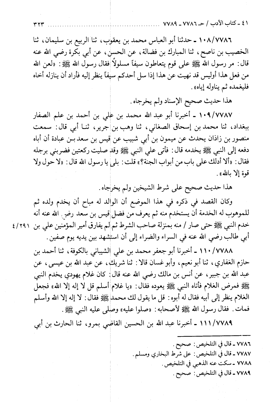 7786 - حَدَّثَنَا أَبُو الْعَبَّاسِ مُحَمَّدُ بْنُ يَعْقُوبَ، ثَنَا الرَّبِيعُ بْنُ سُلَيْمَانَ، ثَنَا الْخَصِيبُ بْنُ نَاصِحٍ، ثَنَا الْمُبَارَكُ بْنُ فَضَالَةَ، عَنِ الْحَسَنِ، عَنْ أَبِي بَكْرَةَ، رَضِيَ اللَّهُ عَنْهُ قَالَ: مَرَّ رَسُولُ اللَّهِ صَلَّى اللهُ عَلَيْهِ وَسَلَّمَ عَلَى قَوْمٍ يَتَعَاطَوْنَ سَيْفًا مَسْلُولًا، فَقَالَ رَسُولُ اللَّهِ صَلَّى اللهُ عَلَيْهِ وَسَلَّمَ: §«لَعَنَ اللَّهُ مَنْ فَعَلَ هَذَا أَوَلَيْسَ قَدْ نَهَيْتُ عَنْ هَذَا إِذَا سَلَّ أَحَدُكُمْ سَيْفًا يَنْظُرُ إِلَيْهِ فَأَرَادَ أَنْ يُنَازِلَهُ أَخَاهُ فَلْيُغْمِدْهُ ثُمَّ يُنَاوِلْهُ إِيَّاهُ» هَذَا حَدِيثٌ صَحِيحُ الْإِسْنَادِ وَلَمْ يُخَرِّجَاهُ "K7786 - صحيح