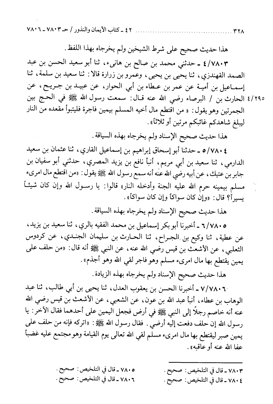7803 - حَدَّثَنِي مُحَمَّدُ بْنُ صَالِحِ بْنِ هَانِئٍ، ثَنَا أَبُو سَعِيدٍ الْحَسَنُ بْنُ عَبْدِ الصَّمَدِ الْقُهُنْدُزِيُّ، ثَنَا يَحْيَى بْنُ يَحْيَى، وَعَمْرُو بْنُ زُرَارَةَ، قَالَا: ثَنَا سَعِيدُ بْنُ سَلَمَةَ، ثَنَا إِسْمَاعِيلُ بْنُ أُمَيَّةَ، عَنْ عُمَرَ بْنِ عَطَاءِ بْنِ أَبِي الْحُوَارِ، عَنْ عُبَيْدِ بْنِ جُرَيْجٍ، عَنِ الْحَارِثِ بْنِ الْبَرْصَاءِ، رَضِيَ اللَّهُ عَنْهُ قَالَ: سَمِعْتُ رَسُولَ اللَّهِ صَلَّى اللهُ عَلَيْهِ وَسَلَّمَ فِي الْحَجِّ بَيْنَ الْجَمْرَتَيْنِ وَهُوَ يَقُولُ: §«مَنِ اقْتَطَعَ مَالَ أَخِيهِ الْمُسْلِمِ بِيَمِينٍ فَاجِرَةٍ فَلْيَتَبَوَّأْ مَقْعَدَهُ مِنَ النَّارِ، لِيُبَلِّغْ شَاهِدُكُمْ غَائِبَكُمْ» مَرَّتَيْنِ أَوْ ثَلَاثًا «هَذَا حَدِيثٌ صَحِيحُ الْإِسْنَادِ وَلَمْ يُخَرِّجَاهُ بِهَذِهِ السِّيَاقَةِ» K7803 - صحيح