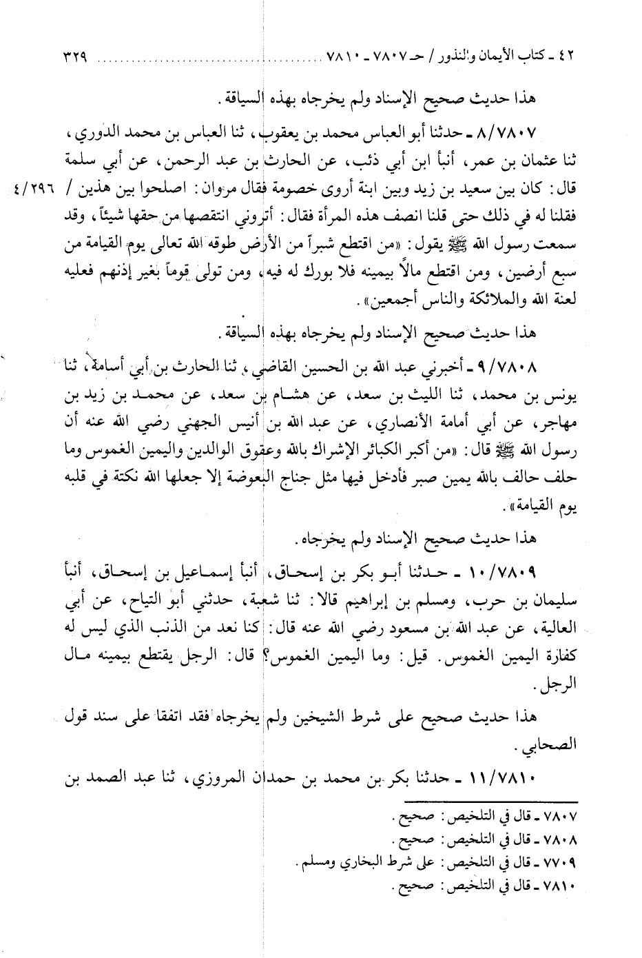 7809 - حَدَّثَنَا أَبُو بَكْرِ بْنُ إِسْحَاقَ، أَنْبَأَ إِسْمَاعِيلُ بْنُ إِسْحَاقَ، أَنْبَأَ سُلَيْمَانُ بْنُ حَرْبٍ، وَمُسْلِمُ بْنُ إِبْرَاهِيمَ، قَالَا: ثَنَا شُعْبَةُ، حَدَّثَنِي أَبُو التَّيَّاحِ، عَنْ أَبِي الْعَالِيَةِ، عَنْ عَبْدِ اللَّهِ بْنِ مَسْعُودٍ، رَضِيَ اللَّهُ عَنْهُ قَالَ: «كُنَّا §نَعُدُّ مِنَ الذَّنْبِ الَّذِي لَيْسَ لَهُ كَفَّارَةٌ الْيَمِينَ الْغَمُوسَ» قِيلَ: وَمَا الْيَمِينُ الْغَمُوسُ؟ قَالَ: «الرَّجُلُ يَقْتَطِعُ بِيَمِينِهِ مَالَ الرَّجُلِ» هَذَا حَدِيثٌ صَحِيحٌ عَلَى شَرْطِ الشَّيْخَيْنِ وَلَمْ يُخَرِّجَاهُ فَقَدْ اتَّفَقَا عَلَى سَنَدِ قَوْلِ الصَّحَابِيِّ "K7809 - على شرط البخاري ومسلم