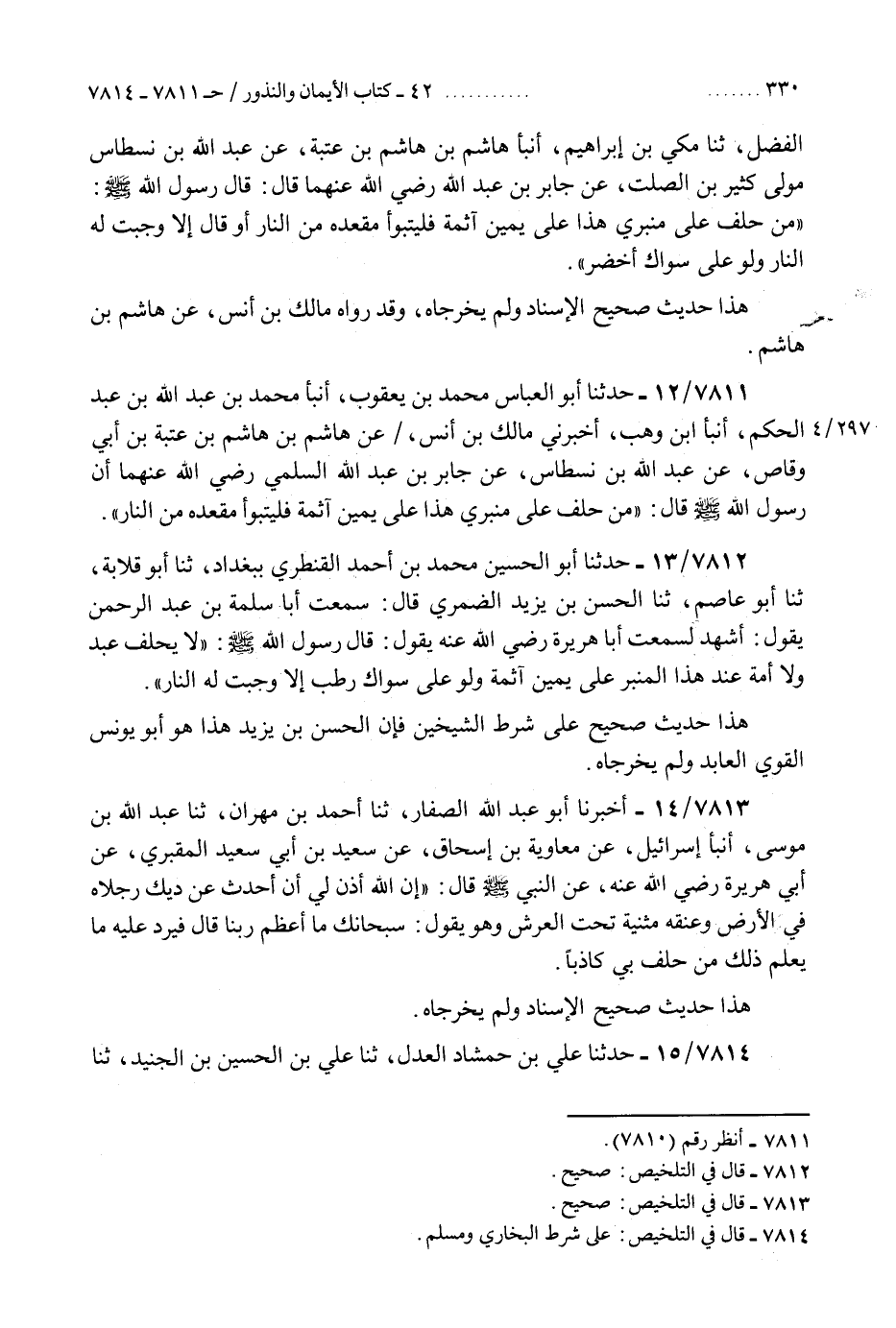 7811 - حَدَّثَنَا أَبُو الْعَبَّاسِ مُحَمَّدُ بْنُ يَعْقُوبَ، أَنْبَأَ مُحَمَّدُ بْنُ عَبْدِ اللَّهِ بْنِ عَبْدِ الْحَكَمِ، أَنْبَأَ ابْنُ وَهْبٍ، أَخْبَرَنِي مَالِكُ بْنُ أَنَسٍ، عَنْ هَاشِمِ بْنِ هَاشِمِ بْنِ عُتْبَةَ بْنِ أَبِي وَقَّاصٍ، عَنْ عَبْدِ اللَّهِ بْنِ نِسْطَاسٍ، عَنْ جَابِرِ بْنِ عَبْدِ اللَّهِ السُّلَمِيِّ، رَضِيَ اللَّهُ عَنْهُمَا أَنَّ رَسُولَ اللَّهِ صَلَّى اللهُ عَلَيْهِ وَسَلَّمَ قَالَ: §«مَنْ حَلَفَ عَلَى مِنْبَرِي هَذَا عَلَى يَمِينٍ آثِمَةٍ فَلْيَتَبَوَّأْ مَقْعَدَهُ مِنَ النَّارِ»