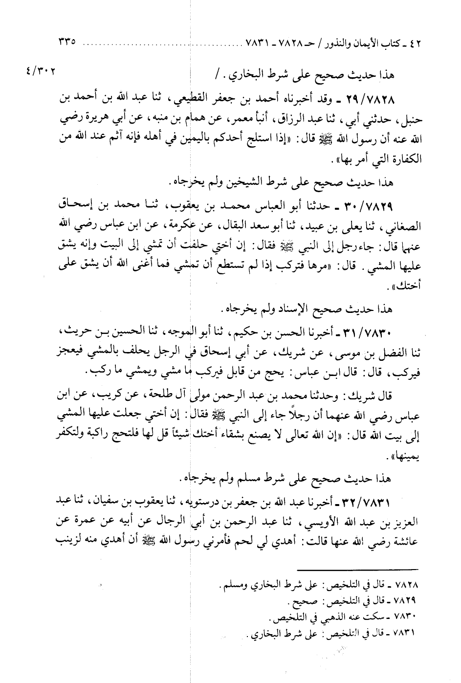 7828 - وَقَدْ أَخْبَرَنَاهُ أَحْمَدُ بْنُ جَعْفَرٍ الْقُطَيْعِيُّ، ثَنَا عَبْدُ اللَّهِ بْنُ أَحْمَدَ بْنِ حَنْبَلٍ، حَدَّثَنِي أَبِي، ثَنَا عَبْدُ الرَّزَّاقِ، أَنْبَأَ مَعْمَرٌ، عَنْ هَمَّامِ بْنِ مُنَبِّهٍ، عَنْ أَبِي هُرَيْرَةَ، رَضِيَ اللَّهُ عَنْهُ، أَنَّ رَسُولَ اللَّهِ صَلَّى اللهُ عَلَيْهِ وَسَلَّمَ قَالَ: §«إِذَا اسْتَلَجَّ أَحَدُكُمْ بِالْيَمِينِ فِي أَهْلِهِ فَإِنَّهُ آثِمٌ عِنْدَ اللَّهِ مِنَ الْكَفَّارَةِ الَّتِي أُمِرَ بِهَا» هَذَا حَدِيثٌ صَحِيحٌ عَلَى شَرْطِ الشَّيْخَيْنِ وَلَمْ يُخَرِّجَاهُ "K7828 - على شرط البخاري ومسلم