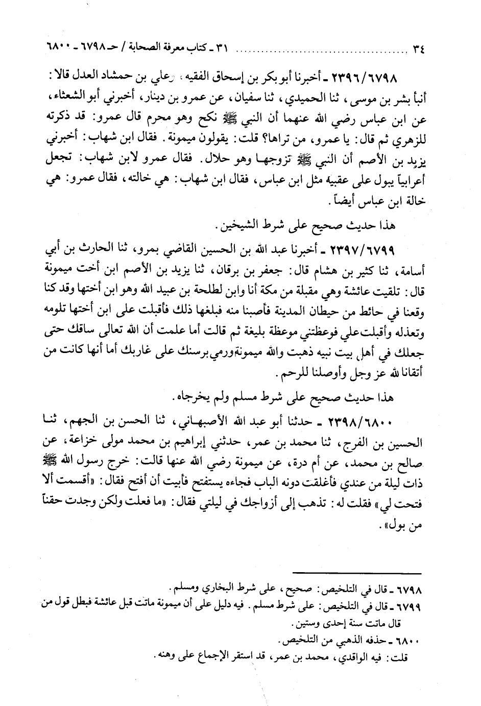 6798 - أَخْبَرَنَا أَبُو بَكْرِ بْنُ إِسْحَاقَ الْفَقِيهُ، وَعَلِيُّ بْنُ حَمْشَاذَ الْعَدْلُ، قَالَا: أَنْبَأَ بِشْرُ بْنُ مُوسَى، ثَنَا الْحُمَيْدِيُّ، ثَنَا سُفْيَانُ، عَنْ عَمْرِو بْنِ دِينَارٍ، أَخْبَرَنِي أَبُو الشَّعْثَاءِ، عَنِ ابْنِ عَبَّاسٍ، رَضِيَ اللَّهُ عَنْهُمَا: «أَنَّ النَّبِيَّ صَلَّى اللهُ عَلَيْهِ وَسَلَّمَ §نَكَحَ وَهُوَ مُحْرِمٌ» قَالَ عَمْرٌو: قَدْ ذَكَرْتُهُ لِلزُّهْرِيِّ، ثُمَّ قَالَ: يَا عَمْرُو، مَنْ تُرَاهَا؟ قُلْتُ: يَقُولُونَ: مَيْمُونَةَ فَقَالَ ابْنُ شِهَابٍ: أَخْبَرَنِي يَزِيدُ بْنُ الْأَصَمِّ، «أَنَّ النَّبِيَّ صَلَّى اللهُ عَلَيْهِ وَسَلَّمَ تَزَوَّجَهَا وَهُوَ حَلَالٌ» فَقَالَ عَمْرٌو لِابْنِ شِهَابٍ: «تَجْعَلُ أَعْرَابِيًّا يَبُولُ عَلَى عَقِبَيْهِ مِثْلَ ابْنِ عَبَّاسٍ» فَقَالَ ابْنُ شِهَابٍ: هِيَ خَالَتُهُ، فَقَالَ عَمْرٌو: «هِيَ خَالَةُ ابْنِ عَبَّاسٍ أَيْضًا» هَذَا حَدِيثٌ صَحِيحٌ عَلَى شَرْطِ الشَّيْخَيْنِ "K6798 - صحيح على شرط البخاري ومسلم