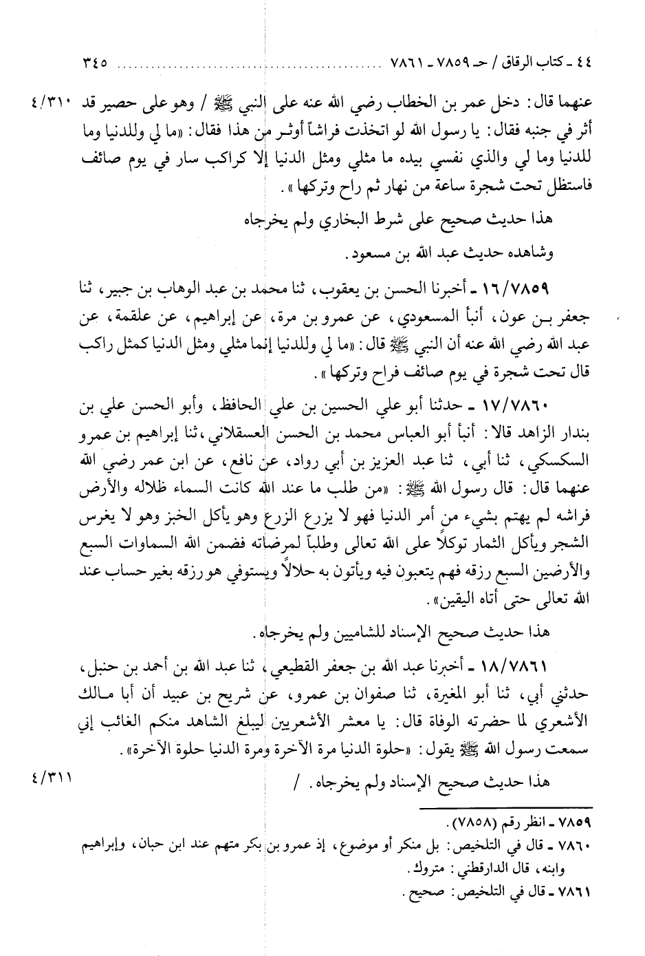 7859 - أَخْبَرَنَا الْحَسَنُ بْنُ يَعْقُوبَ، ثَنَا مُحَمَّدُ بْنُ عَبْدِ الْوَهَّابِ بْنِ حَبِيبٍ، ثَنَا جَعْفَرُ بْنُ عَوْنٍ، أَنْبَأَ الْمَسْعُودِيُّ، عَنْ عَمْرِو بْنِ مُرَّةَ، عَنْ إِبْرَاهِيمَ، عَنْ عَلْقَمَةَ، عَنْ عَبْدِ اللَّهِ، رَضِيَ اللَّهُ عَنْهُ أَنَّ النَّبِيَّ صَلَّى اللهُ عَلَيْهِ وَسَلَّمَ، قَالَ: §«مَا لِي وَلِلدُّنْيَا إِنَّمَا مَثَلِي وَمَثَلُ الدُّنْيَا كَمَثَلِ رَاكِبٍ قَالَ تَحْتَ شَجَرَةٍ فِي يَوْمٍ صَائِفٍ فَرَاحَ وَتَرَكَهَا»