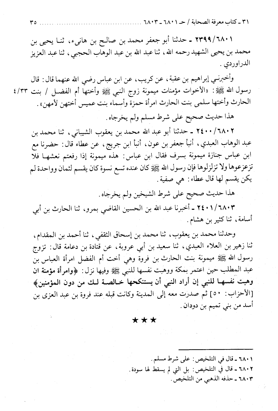 6801 - حَدَّثَنَا أَبُو جَعْفَرٍ مُحَمَّدُ بْنُ صَالِحِ بْنِ هَانِئٍ، ثَنَا يَحْيَى بْنُ مُحَمَّدِ بْنِ يَحْيَى الشَّهِيدُ، رَحِمَهُ اللَّهُ، ثَنَا عَبْدُ اللَّهِ بْنُ عَبْدِ الْوَهَّابِ الْحَجَبِيُّ، ثَنَا عَبْدُ الْعَزِيزِ الدَّرَاوَرْدِيُّ، وَأَخْبَرَنِي إِبْرَاهِيمُ بْنُ عُقْبَةَ، عَنْ كُرَيْبٍ، عَنِ ابْنِ عَبَّاسٍ، رَضِيَ اللَّهُ عَنْهُمَا قَالَ: قَالَ رَسُولُ اللَّهِ صَلَّى اللهُ عَلَيْهِ وَسَلَّمَ: " §الْأَخَوَاتُ مُؤْمِنَاتٌ: مَيْمُونَةُ زَوْجُ النَّبِيِّ صَلَّى اللهُ عَلَيْهِ وَسَلَّمَ، وَأُخْتُهَا أُمُّ الْفَضْلِ بِنْتُ الْحَارِثِ، وَأُخْتُهَا سَلْمَى بِنْتُ الْحَارِثِ امْرَأَةُ حَمْزَةِ، وَأَسْمَاءُ بِنْتُ عُمَيْسٍ أُخْتُهُنَّ لِأُمِّهِنَّ «هَذَا حَدِيثٌ صَحِيحٌ عَلَى شَرْطِ مُسْلِمٍ وَلَمْ يُخَرِّجَاهُ» K6801 - على شرط مسلم