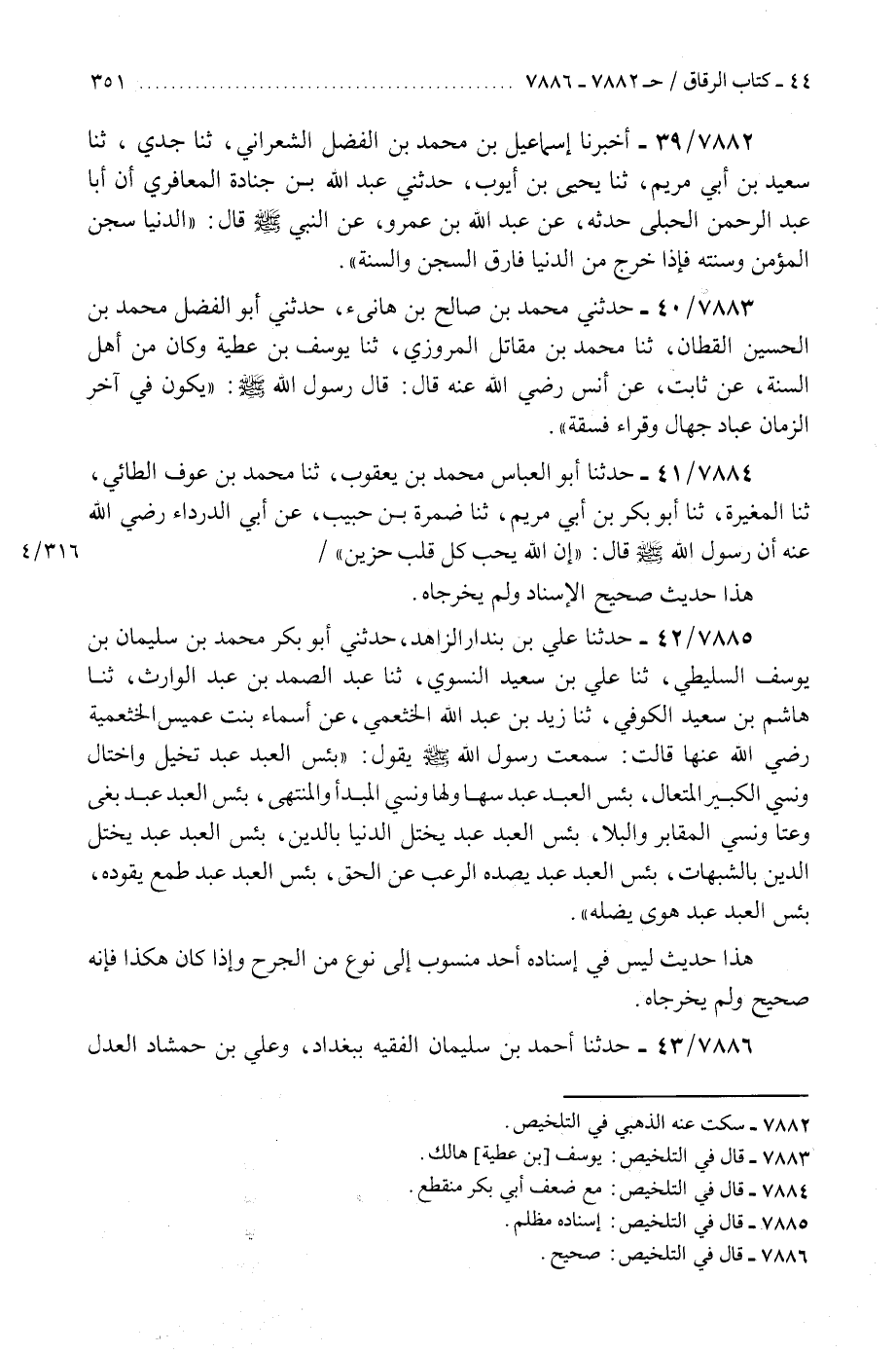 7885 - حَدَّثَنَا عَلِيُّ بْنُ بُنْدَارٍ الزَّاهِدُ، حَدَّثَنِي أَبُو بَكْرٍ مُحَمَّدُ بْنُ سُلَيْمَانَ بْنِ يُوسُفَ السَّلِيطِيُّ، ثَنَا عَلِيُّ بْنُ سَعِيدٍ النَّسَوِيُّ، ثَنَا عَبْدُ الصَّمَدِ بْنُ عَبْدِ الْوَارِثِ، ثَنَا هَاشِمُ بْنُ سَعِيدٍ الْكُوفِيُّ، ثَنَا زَيْدُ بْنُ عَبْدِ اللَّهِ الْخَثْعَمِيُّ، عَنْ أَسْمَاءَ بِنْتِ عُمَيْسٍ الْخَثْعَمِيَّةِ، رَضِيَ اللَّهُ عَنْهَا قَالَتْ: سَمِعْتُ رَسُولَ اللَّهِ صَلَّى اللهُ عَلَيْهِ وَسَلَّمَ يَقُولُ: «§بِئْسَ الْعَبْدُ عَبْدٌ تَخَيَّلَ وَاخْتَالَ وَنَسِيَ الْكَبِيرَ الْمُتَعَالِ، بِئْسَ الْعَبْدُ عَبْدٌ سَهَا وَلَهَا وَنَسِيَ الْمَبْدَأَ وَالْمُنْتَهَى، بِئْسَ الْعَبْدُ عَبْدٌ بَغَى وَعَتَا وَنَسِيَ الْمَقَابِرَ وَالْبِلَا، بِئْسَ الْعَبْدُ عَبْدٌ يَخْتِلُ الدُّنْيَا بِالدِّينِ، بِئْسَ الْعَبْدُ عَبْدٌ يَخْتِلُ الدِّينَ بِالشُّبُهَاتِ، بِئْسَ الْعَبْدُ عَبْدٌ يَصُدُّهُ الرُّعْبُ عَنِ الْحَقِّ، بِئْسَ الْعَبْدُ عَبْدٌ طَمَعٌ يَقُودُهُ، بِئْسَ الْعَبْدُ عَبْدُ هَوًى يُضِلُّهُ» هَذَا حَدِيثٌ لَيْسَ فِي إِسْنَادِهِ أَحَدٌ مَنْسُوبٌ إِلَى نَوْعٍ مِنَ الْجَرْحِ وَإِذَا كَانَ هَكَذَا فَإِنَّهُ صَحِيحٌ وَلَمْ يُخَرِّجَاهُ "K7885 - إسناده مظلم