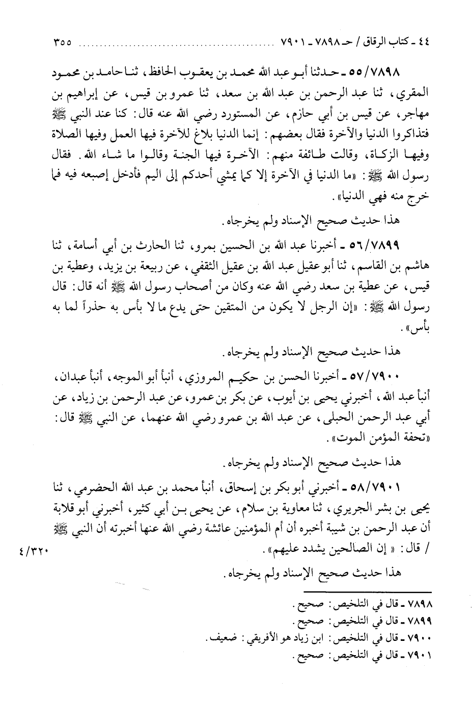7900 - أَخْبَرَنَا الْحَسَنُ بْنُ حَلِيمٍ الْمَرْوَزِيُّ، أَنْبَأَ أَبُو الْمُوَجَّهِ، أَنْبَأَ عَبْدَانُ، أَنْبَأَ عَبْدُ اللَّهِ، أَخْبَرَنِي يَحْيَى بْنُ أَيُّوبَ، عَنْ بَكْرِ بْنِ عَمْرٍو، عَنْ عَبْدِ الرَّحْمَنِ بْنِ زِيَادٍ، عَنْ أَبِي عَبْدِ الرَّحْمَنِ الْحُبُلِيِّ، عَنْ عَبْدِ اللَّهِ بْنِ عَمْرٍو رَضِيَ اللَّهُ عَنْهُمَا، عَنِ النَّبِيِّ صَلَّى اللهُ عَلَيْهِ وَسَلَّمَ قَالَ: §«تُحْفَةُ الْمُؤْمِنِ الْمَوْتُ» هَذَا حَدِيثٌ صَحِيحُ الْإِسْنَادِ وَلَمْ يُخَرِّجَاهُ "K7900 - ابن زياد هوالأفريقي ضعيف