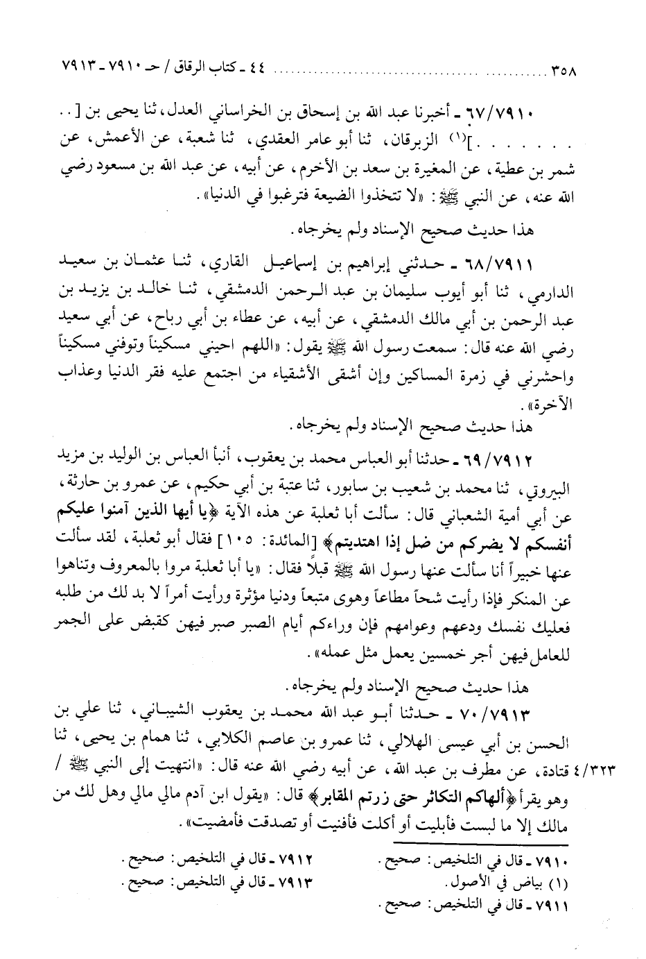 7911 - حَدَّثَنِي إِبْرَاهِيمُ بْنُ إِسْمَاعِيلَ الْقَارِئُ، ثَنَا عُثْمَانُ بْنُ سَعِيدٍ الدَّارِمِيُّ، ثَنَا أَبُو أَيُّوبَ سُلَيْمَانُ بْنُ عَبْدِ الرَّحْمَنِ الدِّمَشْقِيُّ، ثَنَا خَالِدُ بْنُ يَزِيدَ بْنِ عَبْدِ الرَّحْمَنِ بْنِ أَبِي مَالِكٍ الدِّمَشْقِيُّ، عَنْ أَبِيهِ، عَنْ عَطَاءِ بْنِ أَبِي رَبَاحٍ، عَنْ أَبِي سَعِيدٍ، رَضِيَ اللَّهُ عَنْهُ قَالَ: سَمِعْتُ رَسُولَ اللَّهِ صَلَّى اللهُ عَلَيْهِ وَسَلَّمَ يَقُولُ: «§اللَّهُمَّ أَحْيِنِي مِسْكِينًا وَتَوَفَّنِي مِسْكِينًا وَاحْشُرْنِي فِي زُمْرَةِ الْمَسَاكِينِ، وَإِنَّ أَشْقَى الِأَشْقِيَاءِ مَنِ اجْتَمَعَ عَلَيْهِ فَقْرُ الدُّنْيَا وَعَذَابُ الْآخِرَةِ» هَذَا حَدِيثٌ صَحِيحُ الْإِسْنَادِ وَلَمْ يُخَرِّجَاهُ "K7911 - صحيح