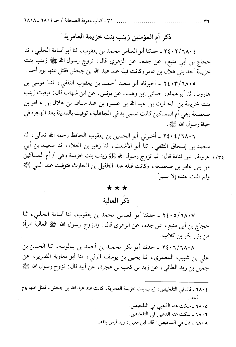 6806 - أَخْبَرَنِي أَبُو الْحُسَيْنِ بْنُ يَعْقُوبَ الْحَافِظُ، رَحِمَهُ اللَّهُ تَعَالَى، ثَنَا مُحَمَّدُ بْنُ إِسْحَاقَ الثَّقَفِيُّ، ثَنَا أَبُو الْأَشْعَثِ، ثَنَا زُهَيْرُ بْنُ الْعَلَاءِ، ثَنَا سَعِيدُ بْنُ أَبِي عَرُوبَةَ، عَنْ قَتَادَةَ، قَالَ: «ثُمَّ §تَزَوَّجَ رَسُولُ اللَّهِ صَلَّى اللهُ عَلَيْهِ وَسَلَّمَ زَيْنَبَ بِنْتَ خُزَيْمَةَ، وَهِيَ أُمُّ الْمَسَاكِينِ مِنْ بَنِي عَامِرِ بْنِ صَعْصَعَةَ وَكَانَتْ قَبْلَهُ عِنْدَ الطُّفَيْلِ بْنِ الْحَارِثِ، فَتُوُفِّيَتْ عِنْدَ النَّبِيِّ صَلَّى اللهُ عَلَيْهِ وَسَلَّمَ وَلَمْ تَلْبَثْ عِنْدَهُ إِلَّا يَسِيرًا» K6806 - سكت عنه الذهبي في التلخيص