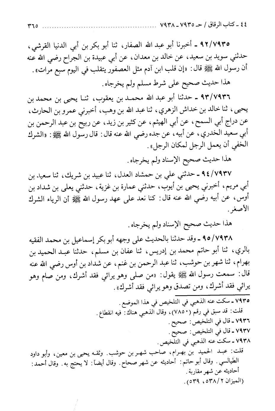 7935 - أَخْبَرَنَا أَبُو عَبْدِ اللَّهِ الصَّفَّارُ، ثَنَا أَبُو بَكْرِ بْنُ أَبِي الدُّنْيَا الْقُرَشِيُّ، حَدَّثَنِي سُوَيْدُ بْنُ سَعِيدٍ، عَنْ خَالِدِ بْنِ مَعْدَانَ، عَنْ أَبِي عُبَيْدَةِ بْنِ الْجَرَّاحِ، رَضِيَ اللَّهُ عَنْهُ أَنَّ رَسُولَ اللَّهِ صَلَّى اللهُ عَلَيْهِ وَسَلَّمَ، قَالَ: «إِنَّ §قَلْبَ ابْنِ آدَمَ مِثْلُ الْعُصْفُورِ يَتَقَلَّبُ فِي الْيَوْمِ سَبْعَ مَرَّاتٍ» هَذَا حَدِيثٌ صَحِيحٌ عَلَى شَرْطِ مُسْلِمٍ وَلَمْ يُخَرِّجَاهُ "K7935 - سكت عنه الذهبي في التلخيص في هذا الموضع وقد سبق برقم 7850 وقال هناك: فيه انقطاع