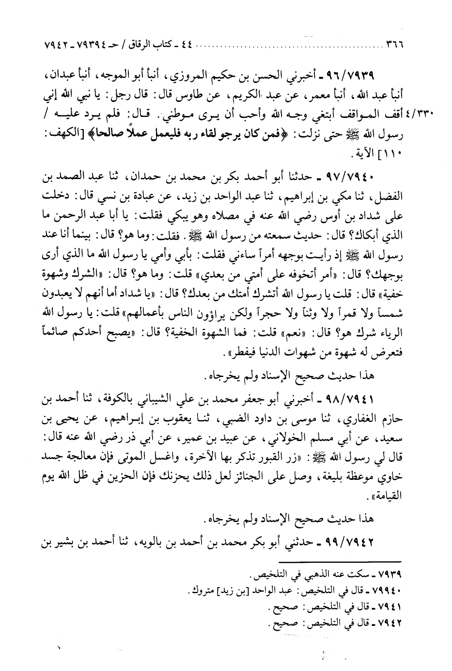 7940 - حَدَّثَنَا أَبُو أَحْمَدَ بَكْرُ بْنُ مُحَمَّدِ بْنِ حَمْدَانَ، ثَنَا عَبْدُ الصَّمَدِ بْنُ الْفَضْلِ، ثَنَا مَكِّيُّ بْنُ إِبْرَاهِيمَ، ثَنَا عَبْدُ الْوَاحِدِ بْنُ زَيْدٍ، عَنْ عُبَادَةَ بْنِ نُسِيٍّ، قَالَ: دَخَلْتُ عَلَى شَدَّادِ بْنِ أَوْسٍ رَضِيَ اللَّهُ عَنْهُ فِي مُصَلَّاهُ وَهُوَ يَبْكِي، فَقُلْتُ: يَا أَبَا عَبْدِ الرَّحْمَنِ مَا الَّذِي أَبْكَاكَ؟ قَالَ: حَدِيثٌ سَمِعْتُهُ مِنْ رَسُولِ اللَّهِ صَلَّى اللهُ عَلَيْهِ وَسَلَّمَ، فَقُلْتُ: وَمَا هُوَ؟ قَالَ: بَيْنَمَا أَنَا عِنْدَ رَسُولِ اللَّهِ صَلَّى اللهُ عَلَيْهِ وَسَلَّمَ إِذْ رَأَيْتُ بِوَجْهِهِ أَمْرًا سَاءَنِي، فَقُلْتُ: بِأَبِي وَأُمِّي يَا رَسُولَ اللَّهِ مَا الَّذِي أَرَى بِوَجْهِكَ؟ قَالَ: «§أَمْرٌ أَتَخَوَّفُهُ عَلَى أُمَّتِي مِنْ بَعْدِي» قُلْتُ: وَمَا هُوَ؟ قَالَ: «الشِّرْكُ وَشَهْوَةٌ خَفِيَّةٌ» قَالَ: قُلْتُ: يَا رَسُولَ اللَّهِ أَتُشْرِكُ أُمَّتُكَ مِنْ بَعْدِكَ؟ قَالَ: «يَا شَدَّادُ، أَمَا إِنَّهُمْ لَا يَعْبُدُونَ شَمْسًا وَلَا قَمَرًا وَلَا وَثَنًا وَلَا حَجَرًا وَلَكِنْ يُرَاءُونَ النَّاسَ بِأَعْمَالِهِمْ» قُلْتُ: يَا رَسُولَ اللَّهِ، الرِّيَاءُ شِرْكٌ هُوَ؟ قَالَ: «نَعَمْ» قُلْتُ: فَمَا الشَّهْوَةُ الْخَفِيَّةُ؟ قَالَ: «يُصْبِحُ أَحَدُكُمْ صَائِمًا فَتَعْرِضُ لَهُ شَهْوَةٌ مِنْ شَهَوَاتِ الدُّنْيَا فَيُفْطِرُ» هَذَا حَدِيثٌ صَحِيحُ الْإِسْنَادِ وَلَمْ يُخَرِّجَاهُ "K7940 - عبد الواحد بن زيد متروك